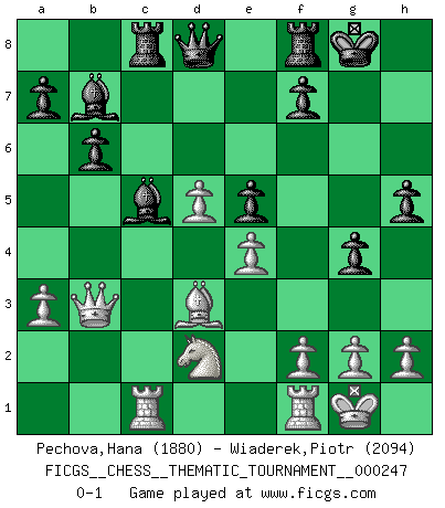 Last move : 0-1 2021 November 24 8:57:56 [Event "FICGS__CHESS__THEMATIC_TOURNAMENT__000247"] [Site "FICGS"] [Date "2021.08.29"] [Round "1"] [White "Pechova,Hana"] [Black "Wiaderek,Piotr"] [Result "0-1"] [WhiteElo "1880"] [BlackElo "2094"] 1.d4 Nf6 2.c4 e6 3.Nf3 b6 4.a3 Bb7 5.Nc3 d5 6.cxd5 Nxd5 7.Qc2 Nxc3 8.bxc3 Nd7 9.e4 c5 10.Bf4 cxd4 11.cxd4 Rc8 12.Qb3 Be7 13.Bd3 g5 14.Be3 O-O 15.O-O g4 16.Nd2 e5 17.d5 Nc5 18.Bxc5 Bxc5 19.Rac1 h5 0-1 Queen's Indian : Petrosian system Kingside Castling by player Black (move 14) Kingside Castling by player White (move 15) Player Black won this chess game. Follow this game move after move (download)Botvinnik tried to take the mystery out of Chess, always relating it to situations in ordinary life. He used to call Chess a typical inexact problem similar to those which people are always having to solve in everyday life. (Garry Kasparov) Wenn Du absolut nicht mehr weißt, was Du tun sollst, dann ist es Zeit für Panik. (John van der Wiel) La enorme capacidad mental, en la que sin ella no puede un jugador de Ajedrez existir, es demasiado requerida por el Ajedrez al grado de que nunca podrá liberar su mente de este juego. (Albert Einstein) Le pion, dans sa simplicité, marche droit devant lui, mais lorsqu'il prend, il le fait obliquement? Ainsi l'homme, tant qu'il reste pauvre, marche dans la droiture et vit honnêtement, mais lorsqu'il recherche les honneurs, il flatte, se parjure et, par les voies obliques, cherche une position supérieure sur l'échiquier du monde. (Jean de Galles) I find your interest interesting. (Gregory House, House M.D.)