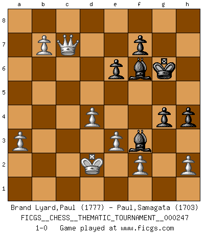 Last move : 1-0 2021 August 30 13:20:4 [Event "FICGS__CHESS__THEMATIC_TOURNAMENT__000247"] [Site "FICGS"] [Date "2021.08.29"] [Round "1"] [White "Brand Lyard,Paul"] [Black "Paul,Samagata"] [Result "1-0"] [WhiteElo "1777"] [BlackElo "1703"] 1.d4 Nf6 2.c4 e6 3.Nf3 b6 4.a3 Bb7 5.Nc3 d5 6.cxd5 Nxd5 7.Nxd5 Bxd5 8.Bf4 Be7 9.Rc1 c6 10.Bxb8 Rxb8 11.Ne5 Rc8 12.Qa4 a5 13.Nxc6 O-O 14.Nxd8 Rxc1+ 15.Kd2 Rxf1 16.Rxf1 Rxd8 17.Qb5 Rb8 18.g4 g6 19.Qd7 Rb7 20.Qc8+ Kg7 21.Rc1 Bf6 22.e3 Bf3 23.Rc7 Rxc7 24.Qxc7 Bxg4 25.Qxb6 h5 26.Qxa5 g5 27.b4 Kg6 28.b5 Bf3 29.Qc7 g4 30.b6 h4 31.b7 1-0 Comment by player 1 : Paul Brand Lyard : Historical Game intituled "Ou comment perdre sa reine pour un petit roque?!" Blacks are black-out! Good game. Partie pliée. Nous jouons l'Inde, la!!!!! Jouons le pion passe..Blacks resigned. Aka /the Sandra Lyard13061975/. Queen's Indian : Petrosian system Kingside Castling by player Black (move 13) Player White won this chess game. Follow this game move after move (download)All my games are real. (Bobby Fischer) Darum geht es im Schach. Einen Tag gibst du deinem Gegner eine Lektion, am nächsten Tag gibt er dir eine. (Robert James Fischer) El juego de Fischer siempre fue nítido, racional y brillante. Uno de los mejores por siempre. (Dave Regis) Nous sommes les pions de la mystérieuse partie d'Echecs jouée par Dieu. Il nous déplace, nous arrête, nous pousse encore, puis nous lance un à un dans la boîte du Néant. Epitaphe sur la tombe de David Janowsky (1868-1927). After growing wildly for years, the field of computing appears to be reaching its infancy. (John Pierce)