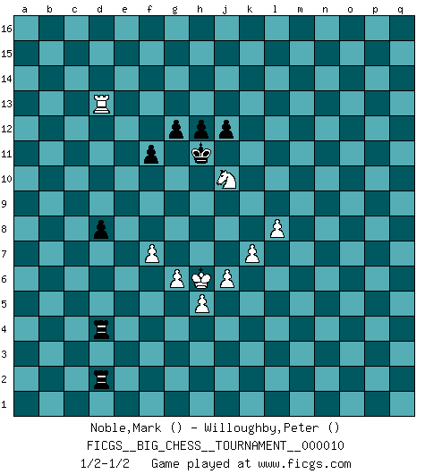 Last move : 1/2-1/2 2007 December 1 20:27:11 [Event "FICGS__BIG_CHESS__TOURNAMENT__000010"] [Site "FICGS"] [Date "2007.07.16"] [Round "1"] [White "Noble,Mark"] [Black "Willoughby,Peter"] [Result "1/2-1/2"] [WhiteElo ""] [BlackElo ""] 1.j2-k4 h15-g13 2.h1-o7 p16-o14 3.o7-c7 b16-c14 4.c7-l15 j15-l14 5.h2-g4 m15-m14 6.l15-b6 p15-p14 7.p1-o3 a16-b16 8.e2-e4 e15-e13 9.f1-b5 m16-m15 10.m2-m4 n15-n13 11.d2-d3 d15-d13 12.l1-o4 f16-d14 13.c1-k8 m14-m13 14.n2-n3 c16-h11 15.o1-f9 h11-f9 16.b5-f9 e16-d16 17.k1-h2 e13-e12 18.k8-d14 c15-d14 19.b1-d2 j14-j13 20.d2-c4 a15-a14 21.f2-f4 h16-n11 22.b6-f6 o16-l13 23.o4-p3 l13-m12 24.f6-h6 n11-h6 25.g4-h6 f15-f13 26.g2-g4 g16-j15 27.h2-j4 k15-k13 28.j1-h2 l16-g12 29.g1-f3 c14-e13 30.c4-e5 k16-j14 31.c2-c4 b15-b13 32.b2-b4 j16-k15 33.b4-b5 b16-c16 34.a2-a4 g12-h11 35.f9-h11 g13-h11 36.a4-a5 e13-f11 37.m1-m3 d13-d12 38.a1-a2 c16-c10 39.a5-a6 d14-d13 40.e5-c6 d16-c16 41.d3-d4 o14-n12 42.d4-d5 c16-c11 43.e4-e5 q16-c16 44.f4-f5 f11-e9 45.e5-e6 e9-c8 46.f3-e5 j15-h13 47.h6-f7 g15-g13 48.k4-h5 o15-o13 49.e5-d7 k15-k14 50.l2-l4 m15-l15 51.l4-l5 d12-d11 52.h2-g3 c10-e10 53.j4-g5 c8-e7 54.f7-d8 e10-e11 55.c6-e7 e11-e7 56.d8-c6 e7-k7 57.k2-k4 l14-k12 58.e1-e4 m12-j9 59.q1-k1 j9-p3 60.q2-p3 l15-l10 61.k1-q1 q15-q13 62.a2-a1 c11-c10 63.q1-q4 l10-q10 64.a1-q1 q10-q4 65.q1-q4 n12-l11 66.m3-m1 n13-n12 67.m1-q1 m13-m12 68.e4-e1 m12-m11 69.q4-p4 c16-p16 70.q1-q5 l11-n10 71.q5-p5 n10-o12 72.e1-q1 k12-m13 73.q1-q8 k7-k10 74.q8-a8 p16-a16 75.p5-p14 o12-p14 76.p4-p14 k14-k15 77.p14-p13 k10-q10 78.p13-o13 j14-k12 79.o3-q4 c10-o10 80.a8-o8 o10-o8 81.o13-o8 a16-p16 82.h5-k6 p16-p10 83.o8-o15 k15-j14 84.o15-d15 h13-f12 85.k6-m5 h11-f10 86.d15-a15 p10-g10 87.h3-h4 f10-e8 88.a15-a14 e8-d6 89.d7-e5 g10-o10 90.m5-o4 o10-j10 91.j3-j4 f12-e10 92.a14-b14 e10-c11 93.k4-k5 j10-j11 94.j4-j5 m13-l11 95.k5-k6 k12-h11 96.g5-f7 d6-e4 97.g3-f4 e4-f2 98.e5-g6 f2-h3 99.f4-g3 h3-k4 100.f7-h8 k4-j2 101.g3-h3 j2-l3 102.b14-c14 b13-b12 103.c14-b14 c11-a10 104.h8-k7 l3-n4 105.o4-q3 f13-f12 106.b14-b16 q13-q12 107.b16-o16 n4-l3 108.g6-j7 n12-n11 109.o16-o11 l11-m9 110.k7-m6 k13-k12 111.o11-o14 j14-h13 112.h3-j3 q10-g10 113.g4-g5 q12-q11 114.j3-k3 l3-k1 115.o14-o9 m9-n7 116.o9-q9 q11-q10 117.q3-o4 k1-h2 118.k3-j3 h2-g4 119.j3-h3 g4-e3 120.j7-h9 j11-j9 121.q9-q7 n7-p8 122.h9-f8 g10-f10 123.f8-h7 j9-k9 124.f5-f6 e3-c4 125.c6-e7 c4-d6 126.e7-g8 f10-b10 127.g8-j7 k9-b9 128.q7-q8 q10-q9 129.b5-b6 b9-b6 130.q8-q9 b6-b3 131.h3-j4 p8-o6 132.q9-q11 o6-p4 133.o4-q3 b3-b2 134.q11-n11 p4-o2 135.q3-o2 b2-o2 136.n11-m11 j13-j12 137.m11-m13 h13-h12 138.m13-p13 o2-j2 139.j4-h5 j2-h2 140.p3-p4 d6-f5 141.m6-k5 b10-b4 142.j7-g6 f5-g3 143.h5-j6 b4-a4 144.p4-p5 a4-a6 145.p5-p6 b12-b11 146.p6-p7 b11-b10 147.p7-p8 a10-c9 148.p13-p10 c9-e10 149.p10-p14 h14-h13 150.p14-b14 h2-b2 151.b14-b13 a6-a9 152.b13-d13 a9-p9 153.d13-e13 h11-f10 154.e6-e7 p9-p8 155.k5-j7 g3-f5 156.l5-l6 p8-p4 157.q4-o5 p4-p2 158.m4-m5 b10-b9 159.o5-n7 b9-b8 160.n7-l8 b8-b7 161.h4-h5 b7-b6 162.g6-e5 b6-b5 163.e13-b13 p2-n2 164.m5-m6 n2-n3 165.j7-g6 b5-b4 166.e5-c6 b4-b3 167.c6-a5 e12-e11 168.g6-e5 f5-d4 169.l8-j7 b2-m2 170.e5-c4 e10-c11 171.b13-b11 c11-d9 172.j7-g6 d9-c7 173.d5-d6 c7-b5 174.a5-c6 n3-n2 175.c6-d4 b5-d4 176.b11-b4 n2-n3 177.g6-e5 m2-m6 178.l6-l7 f10-e8 179.c4-a5 e8-d6 180.b4-d4 b3-b2 181.d4-b4 m6-m2 182.a5-c4 d6-c4 183.e5-c4 n3-n2 184.h7-f8 m2-g2 185.f8-e6 g2-e2 186.e6-g7 e2-c2 187.c4-b2 c2-b2 188.b4-d4 d11-d10 189.j6-h6 b2-b5 190.g5-g6 n2-b2 191.f6-f7 b5-b4 192.d4-d8 b4-j4 193.d8-h8 h12-j13 194.e7-e8 b2-j2 195.j5-j6 j4-l4 196.l7-l8 j2-d2 197.k6-k7 e11-e10 198.h8-h10 f12-f11 199.h10-h9 g13-g12 200.h9-a9 d2-c2 201.a9-a10 d10-d9 202.e8-d9 e10-d9 203.a10-d10 c2-d2 204.g7-f9 l4-d4 205.d10-d13 j13-h12 206.f9-e11 d9-d8 207.e11-f13 h12-j11 208.f13-g11 h13-h12 209.g11-h13 j11-h11 210.h13-k12 h11-g11 211.k12-j10 g11-h11 212.j10-k12 h11-g11 213.k12-j10 g11-h11 1/2-1/2 Follow this game move after move (download)For me, Chess is life and every game is like a new life. Every Chess player gets to live many lives in one lifetime. (Eduard Gufeld) Das Schachspiel ist ein See, in welchem eine Mücke baden und ein Elefant ertrinken kann. (Emanuel Lasker) No solamente yo pronostico su triunfo sobre Botvinnik, sino que me adelanto y digo que probablemente Fischer es el jugador de Ajedrez mas grande que haya existido. (John Collins) Le plus grand jeu de l'esprit jamais inventé, plus vous l'apprenez, plus vous y prenez du plaisir. (Garry Kasparov) At last I discovered the true beauty of chess. So I proposed to her. (Dinesh De Silva)