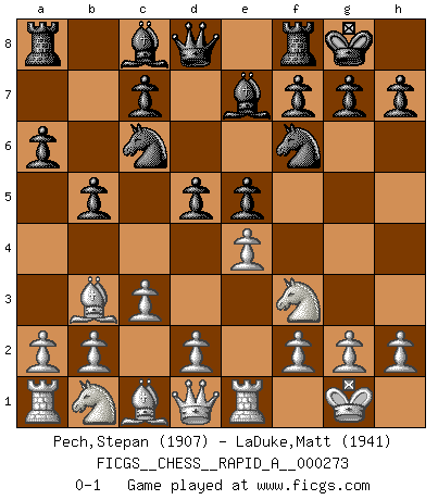 Last move : 0-1 2021 October 15 7:4:49 [Event "FICGS__CHESS__RAPID_A__000273"] [Site "FICGS"] [Date "2021.09.03"] [Round "1"] [White "Pech,Stepan"] [Black "LaDuke,Matt"] [Result "0-1"] [WhiteElo "1907"] [BlackElo "1941"] 1.e4 e5 2.Nf3 Nc6 3.Bb5 a6 4.Ba4 Nf6 5.O-O Be7 6.Re1 b5 7.Bb3 O-O 8.c3 d5 0-1 Ruy Lopez : Closed, 7...O-O Kingside Castling by player White (move 5) Kingside Castling by player Black (move 7) Player Black won this chess game. Follow this game move after move (download)If your opponent cannot do anything active, then don't rush the position; instead you should let him sit there, suffer, and beg you for a draw. (Jeremy Silman) Mein Gehirn das ist mein zweitwichtigstes Organ [Aus dem Film: Der Schläfer]. (Woody Allen) Si tu oponente no puede hacer nada activo, entonces no apures la posición; En vez de eso, dejalo estar sentado ahí, sufriendo y rogandote por un empate. (Jeremy Silman) Karpov est une pièce de musée. (Garry Kasparov) The greatest con, that he ever pulled... was making you believe... that he is you. (Revolver, movie)