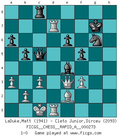 Last move : 1-0 2021 November 16 11:46:33 [Event "FICGS__CHESS__RAPID_A__000273"] [Site "FICGS"] [Date "2021.09.03"] [Round "1"] [White "LaDuke,Matt"] [Black "Cleto Junior,Dirceu"] [Result "1-0"] [WhiteElo "1941"] [BlackElo "2093"] 1.e4 c5 2.Nf3 d6 3.d4 cxd4 4.Nxd4 Nf6 5.Nc3 a6 6.Be3 e6 7.Be2 Qc7 8.Qd2 Nbd7 9.g4 h6 10.O-O-O b5 11.a3 Bb7 12.f3 d5 13.exd5 Nxd5 14.Nxd5 Bxd5 15.Rhe1 Bd6 16.Nf5 O-O 17.Nxd6 Qxd6 18.Bd4 Rfc8 19.g5 hxg5 20.Rg1 f6 21.h4 Rc7 22.hxg5 f5 23.g6 Rac8 24.c3 Nf8 25.Qe3 Rd7 26.Be5 Qc5 27.Rd4 Be4 28.Rgd1 Nxg6 29.Bxg7 Kxg7 30.Rxd7+ 1-0 Sicilian : Najdorf, Byrne (English) attack Queenside Castling by player White (move 10) Kingside Castling by player Black (move 16) Player White won this chess game. Follow this game move after move (download)When you don't know what to play, wait for an idea to come into your opponent's mind. You may be sure that idea will be wrong. (Siegbert Tarrasch) Es gibt nur zwei wahre Schachgenies - das andere war Wilhelm Steinitz, der Weltmeister von 1872 bis 1894. (Robert James Fischer) Fischer era un maestro de claridad y un Rey del posicionamiento astuto. Sus oponentes podían ver hacia donde se dirigía pero eran impotentes para detenerlo. (Bruce Pandolfini) Les échecs sont un jeu par leur forme, un art par leur essence et une science par sa difficulté d'acquisition. Ils peuvent vous procurer autant de plaisir qu'un bon livre ou une belle musique, mais vous n'aurez une réelle joie que si vous arrivez à bien jouer. (Tigran Petrosian) We're missing something. (Gregory House, House M.D.)