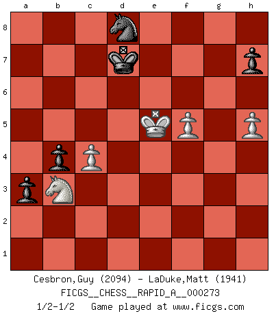 Last move : 1/2-1/2 2021 November 25 2:30:38 [Event "FICGS__CHESS__RAPID_A__000273"] [Site "FICGS"] [Date "2021.09.03"] [Round "1"] [White "Cesbron,Guy"] [Black "LaDuke,Matt"] [Result "1/2-1/2"] [WhiteElo "2094"] [BlackElo "1941"] 1.d4 Nf6 2.c4 g6 3.Nc3 d5 4.cxd5 Nxd5 5.Bd2 Bg7 6.e4 Nxc3 7.Bxc3 O-O 8.Qd2 c5 9.d5 e6 10.Bc4 Bxc3 11.bxc3 b5 12.Bxb5 exd5 13.exd5 Nd7 14.c4 Ne5 15.f4 Qe7 16.Ne2 Qh4+ 17.g3 Nf3+ 18.Kf2 Nxd2 19.gxh4 a6 20.Bc6 Rb8 21.Rhc1 Rb2 22.Ke3 Bg4 23.Ng3 Rfb8 24.Rc3 f5 25.d6 Kf8 26.Rac1 Rxa2 27.R1c2 Rxc2 28.Rxc2 Nb3 29.Rb2 Rb4 30.h5 gxh5 31.h3 Na5 32.Rxb4 cxb4 33.hxg4 Nxc6 34.gxh5 a5 35.Nxf5 a4 36.d7 a3 37.Nd4 Nd8 38.Nb3 Ke7 39.Kd4 Ne6+ 40.Ke5 Kxd7 41.f5 Nd8 1/2-1/2 King's Indian defense, 3.Nc3 Kingside Castling by player Black (move 7) 10 pieces endgame at move 40 : White KNPPP , Black KNPPP WHITE : King + 1 Knight 3 Pawns BLACK : King + 1 Knight 3 Pawns This chess game ended in a draw. Follow this game move after move (download)No one ever won a game by resigning. (Unknown) Ich verachte Kasparow. (Viktor Kortschnoi) Un Peón pasado es un criminal, quién debe ser mantenido bajo candado y llave. Leves medidas, tales como vigilancia policiaca, no son suficientes. (Aaron Nimzovich) Ce qui caractérise les parties de combat, c'est que si le défenseur a constamment de difficiles problèmes à résoudre, l'attaquant doit chercher sans relâche de nouvelles possibilités d'attaque. (Koblentz) Waiting for chance ? Play in casinos. (FICGS proverb)