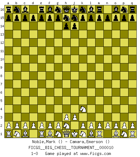 Last move : 1-0 2007 August 20 22:38:36 [Event "FICGS__BIG_CHESS__TOURNAMENT__000010"] [Site "FICGS"] [Date "2007.07.16"] [Round "1"] [White "Noble,Mark"] [Black "Camara,Emerson"] [Result "1-0"] [WhiteElo ""] [BlackElo ""] 1.j2-k4 1-0 This big chess game has been lost on time (started : 2007.07.16 14:44:43) Follow this game move after move (download)A Chess game is divided into three stages: the first, when you hope you have the advantage, the second when you believe you have an advantage, and the third... when you know you're going to lose ! (Savielly Tartakower) Konzentriere dich auf materielle Gewinne. Nimm, was dir dein Gegner gibt, ausser es gibt einen guten Grund der dagegenspricht. (Robert James Fischer) Los libros de Ajedrez deben de usarse igual como usamos los anteojos: para mejorar la vista, aunque algunos jugadores los quieren usar como si ellos les otorgaran la vision. (José Raúl Capablanca) L'attaque fait le spectacle, la défense gagne les matchs. (Dicton footballistique) The project of the man are lower than those of the sky. (Chinese proverb)