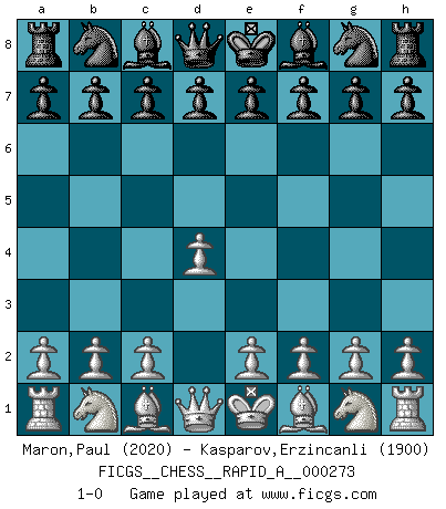 Last move : 1-0 2021 October 3 17:52:12 [Event "FICGS__CHESS__RAPID_A__000273"] [Site "FICGS"] [Date "2021.09.03"] [Round "1"] [White "Maron,Paul"] [Black "Kasparov,Erzincanli"] [Result "1-0"] [WhiteElo "2020"] [BlackElo "1900"] 1.d4 1-0 This chess game has been lost on time (started : 2021.09.03 2:13:19) Queen's pawn Player White won this chess game. Follow this game move after move (download)Chess is a terrible game. If you have no center, your opponent has a freer position. If you do have a center, then you really have something to worry about ! (Siegbert Tarrasch) Ein Remis kann durch Wiederholung von drei Zügen oder durch einen schlechte Zug erreicht werden. (Savielly Grigorievitsch Tartakower) Todavía soy una víctima del Ajedrez. Tiene toda la belleza del arte y mucho mas. No puede ser comercializado. El Ajedrez es mas puro que el arte en su posición social. (Marcel Duchamp) On a dit que l'homme se distingue de l'animal par le fait qu'il achète plus de livres qu'il ne peut en lire. Je voudrais suggérer qu'inclure à la liste des livres quelques livres d'échecs rendrait la distinction manifeste. (Edward Lasker) Begin at the beginning and go on till you come to the end; then stop. (Lewis Carrol, Alice in Wonderland)