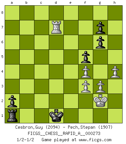 Last move : 1/2-1/2 2022 February 22 9:5:52 [Event "FICGS__CHESS__RAPID_A__000273"] [Site "FICGS"] [Date "2021.09.03"] [Round "1"] [White "Cesbron,Guy"] [Black "Pech,Stepan"] [Result "1/2-1/2"] [WhiteElo "2094"] [BlackElo "1907"] 1.d4 d5 2.c4 c6 3.Nf3 Nf6 4.Nc3 e6 5.Bg5 Nbd7 6.cxd5 exd5 7.e3 Be7 8.Bd3 O-O 9.Qc2 Re8 10.O-O Nf8 11.h3 Ne4 12.Bf4 f5 13.Ne5 Ng6 14.Nxg6 hxg6 15.f3 Nd6 16.Rfe1 Bg5 17.Re2 Bxf4 18.exf4 Qh4 19.Rxe8+ Nxe8 20.Ne2 Nc7 21.Qc5 Qf6 22.Rc1 Ne6 23.Qc3 Bd7 24.g3 b6 25.h4 a5 26.Kf2 Nc7 27.Qd2 Qd6 28.Qc3 Re8 29.Kg2 Ne6 30.Rd1 a4 31.Qd2 c5 32.dxc5 bxc5 33.Bc4 Nc7 34.Nc3 Bc6 35.Nxd5 Nxd5 36.Bxd5+ Qxd5 37.Qxd5+ Bxd5 38.Rxd5 Re2+ 39.Kh3 Rxb2 40.Rxc5 Rxa2 41.Ra5 a3 42.Ra7 Ra1 43.Kg2 a2 44.Ra5 Kf7 45.Ra6 Ke7 46.Ra7+ Kd6 47.Ra6+ Kd5 48.Ra7 Kd4 49.Ra6 Ke3 50.Ra7 Ke2 51.Ra6 Kd2 52.Ra7 Kc2 53.Rc7+ Kb2 54.Rb7+ Kc1 55.Rc7+ Kd1 56.Rd7+ 1/2-1/2 QGD Slav : 4.Nc3 Kingside Castling by player Black (move 8) Kingside Castling by player White (move 10) This chess game ended in a draw. Follow this game move after move (download)The passion for playing Chess is one of the most unaccountable in the world. (H.G. Wells) Den Ruhm habe ich schon, jetzt brauche ich noch das Geld. (Wilhelm Steinitz) Hasta este punto, las blancas han seguido un análisis bien conocido. Pero ahora el hace un error fatal: empieza a usar su propia cabeza. (Siegbert Tarrasch) Le thème de l'attaque double intervient d'une manière ou d'une autre dans l'immense majorité des combinaisons. (Youri Averbakh) Those parts of the system that you can hit with a hammer (not advised) are called hardware; those program instructions that you can only curse at are called software. (Anonymous)