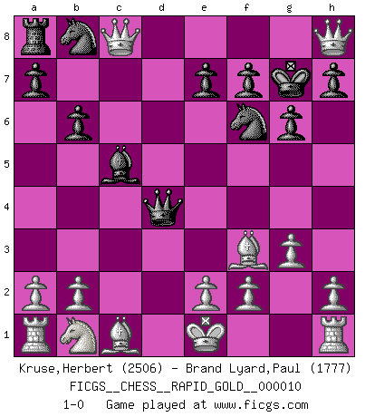 Last move : 1-0 2021 September 4 15:10:40 [Event "FICGS__CHESS__RAPID_GOLD__000010"] [Site "FICGS"] [Date "2021.09.03"] [Round "2"] [White "Kruse,Herbert"] [Black "Brand Lyard,Paul"] [Result "1-0"] [WhiteElo "2506"] [BlackElo "1777"] 1.Nf3 d5 2.g3 g6 3.Bg2 Bg7 4.d4 Bg4 5.c4 Bxf3 6.Bxf3 c6 7.Qb3 b6 8.cxd5 Bxd4 9.Qa4 Bc5 10.dxc6 Qd4 11.c7 Kf8 12.c8Q+ Kg7 13.Qa4e8 Nf6 14.Qxh8+ 1-0 Reti : King's Indian attack Promotion Queen by player White (move 12) Player White won this chess game. Follow this game move after move (download)Nonsense was the last thing Fischer was interested in, as far as Chess was concerned. (Elie Agur) Dein Körper muss in Topform sein. Dein Schach verfällt, wenn dein Körper verfällt. Der Körper kann nicht vom Geist getrennt werden. (Robert James Fischer) El Jaque al descubierto es el bombardero del tablero. (Reuben Fine) Les Echecs sont et restent toujours un combat, un combat intégral comme la boxe, la lutte ou un autre sport, et où il doit y avoir un vainqueur et un vaincu. (Joseph Emil Diemer) My poor ole parrot... Is not in the circulation of displays ....poo hoo hoo :) (Wayne Lowrance's enigma)