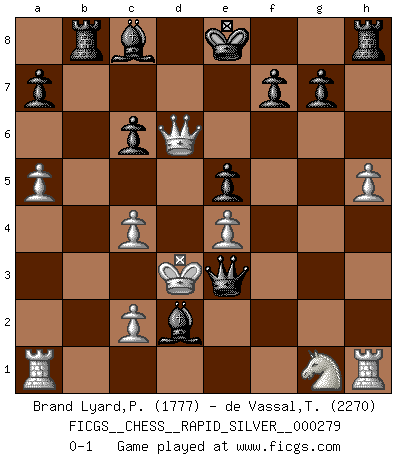 Last move : 0-1 2021 September 15 15:40:14 [Event "FICGS__CHESS__RAPID_SILVER__000279"] [Site "FICGS"] [Date "2021.09.03"] [Round "1"] [White "Brand Lyard,Paul"] [Black "de Vassal,Thibault"] [Result "0-1"] [WhiteElo "1777"] [BlackElo "2270"] 1.e4 c5 2.h4 Nc6 3.Bb5 Nf6 4.Bxc6 bxc6 5.d3 e5 6.Bg5 Be7 7.Bxf6 Bxf6 8.a4 Bxh4 9.g3 Bf6 10.a5 d5 11.f3 Rb8 12.b3 Be7 13.g4 Bh4+ 14.Ke2 h5 15.gxh5 c4 16.bxc4 dxc4 17.dxc4 Qg5 18.Qd6 Qg2+ 19.Ke3 Bg5+ 20.f4 Bxf4+ 21.Kd3 Qf1+ 22.Kc3 Qe1+ 23.Nd2 Bxd2+ 24.Kd3 Qe3+ 0-1 Sicilian defense Player Black won this chess game. Follow this game move after move (download)Chess is the art of analysis. (Mikhail Botvinnik) Ein Buch ist ein Spiegel; wenn ein Affe hineinsieht, so kann kein Apostel heraus gucken. (Georg Christoph Lichtenberg) La esencia del Ajedrez es pensar acerca de lo que el Ajedrez es. (David Bronstein) Les échecs, c'est la lutte contre l'erreur. (Johannes Zukertort) Shallow men believe in luck. Strong men belive in cause and effect. (Ralph Waldo Emerson)