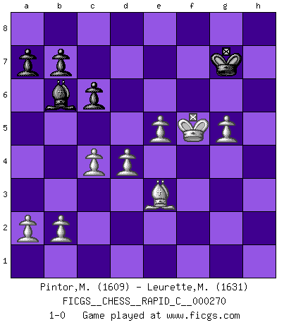 Last move : 1-0 2021 September 15 14:55:54 [Event "FICGS__CHESS__RAPID_C__000270"] [Site "FICGS"] [Date "2021.09.03"] [Round "1"] [White "Pintor,Manuel"] [Black "Leurette,Marc-Antoine"] [Result "1-0"] [WhiteElo "1609"] [BlackElo "1631"] 1.e4 e5 2.f4 exf4 3.Nf3 g5 4.Bc4 Bc5 5.d4 Bb6 6.O-O d6 7.Kh1 Be6 8.Bxe6 fxe6 9.e5 d5 10.h4 h6 11.Nh2 Nc6 12.Qh5+ Kd7 13.Qf7+ Kc8 14.Qxe6+ Qd7 15.Qxd7+ Kxd7 16.c3 Ke6 17.Nd2 Nge7 18.Ndf3 Nf5 19.Kg1 Ng3 20.Rf2 Rag8 21.Ng4 h5 22.Nf6 Rg7 23.hxg5 Ne4 24.Re2 h4 25.Nxe4 dxe4 26.Rxe4 h3 27.Bxf4 hxg2 28.Kxg2 Ne7 29.Rh1 Rf8 30.c4 Ng6 31.Be3 c6 32.Nh4 Rfg8 33.Nxg6 Rxg6 34.Kf3 Rf8+ 35.Rf4 Rxf4+ 36.Kxf4 Kf7 37.Rh7+ Rg7 38.Rxg7+ Kxg7 39.Kf5 1-0 KGA : King's knight's gambit Kingside Castling by player White (move 6) Player White won this chess game. Follow this game move after move (download)The battle for the ultimate truth will never be won. And that's why Chess is so fascinating. (Hans Kmoch) Die starken Figuren des Gegners muss man abtauschen. (José Raúl Capablanca) Ciertamente el estado mental actual de Bobby Fischer es una tragedia. Uno de los mas grandes jugadores de Ajedrez del mundo -el orgullo y pena del Ajedrez Americano. (Frank Brady) Botvinnik disait en comparant les échecs à la musique: Il existe une science dont le but est l'étude de l'acoustique et des sons. Mais il y a aussi un art qui se sert de l'océan des sons : c'est la musique. De toute évidence, il en est de même pour la pensée. La logique est l'étude des lois de la réflexion et les échecs reflètent, en tant qu'art, le côté logique de la réflexion, sous la forme d'images artistiques... Extrait de Fischer - Spassky, Reykjavik 1972 par Alexander & F. Wyndham (Ed. Solar), p 37. A good programmer is someone who always looks both ways before crossing a one-way street. (Doug Linder)