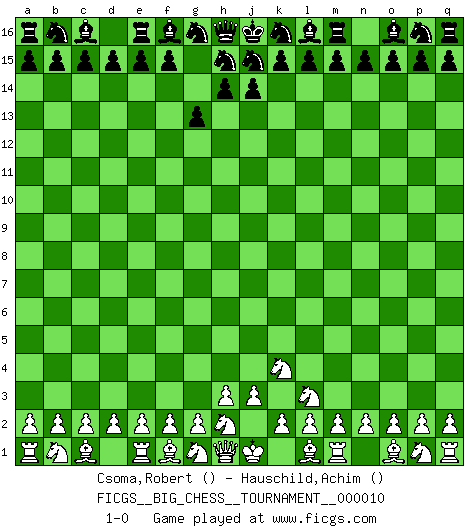 Last move : 1-0 2007 August 9 5:10:17 [Event "FICGS__BIG_CHESS__TOURNAMENT__000010"] [Site "FICGS"] [Date "2007.07.16"] [Round "1"] [White "Csoma,Robert"] [Black "Hauschild,Achim"] [Result "1-0"] [WhiteElo ""] [BlackElo ""] 1.k1-l3 g15-g13 2.j2-k4 1-0 Follow this game move after move (download)I don't believe in psychology. I believe in good moves. (Bobby Fischer) Im Spitzenschach von heute geht es nur um Vorbereitung, um tiefgründige, sorgfältige Eröffnungsvorbereitung. (Nigel Short) La mitad de las variaciones que son calculadas en una partida de torneo, resultan ser completamente superfluas. Desafortunadamente, nadie sabe por adelantado cual mitad. (Jan Tinman) Le profane ne songe pas à la somme de jouissance dont il se prive, qui méconnaît ce jeu aux ressources aussi variées que passionnantes. (Jean-Marie Jeanton-Lamarche) Locking firmely the window serves nothing, only small thiefs pass through there, the big thiefs enter through the front door. (Luc-Olivier Leclerc)