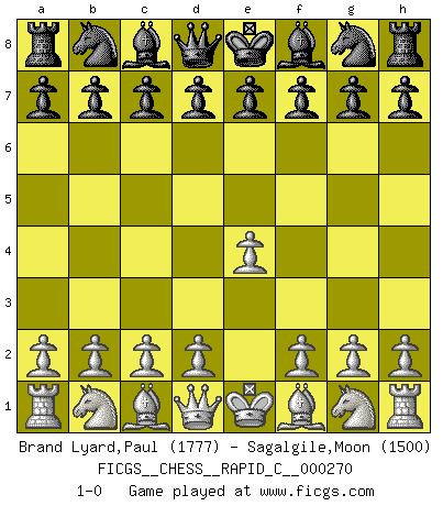 Last move : 1-0 2021 October 4 6:29:12 [Event "FICGS__CHESS__RAPID_C__000270"] [Site "FICGS"] [Date "2021.09.03"] [Round "1"] [White "Brand Lyard,Paul"] [Black "Sagalgile,Moon"] [Result "1-0"] [WhiteElo "1777"] [BlackElo "1500"] 1.e4 1-0 This chess game has been lost on time (started : 2021.09.03 22:6:8) King's pawn Opening Player White won this chess game. Follow this game move after move (download)In the perfect Chess combination as in a first-rate short story, the whole plot and counter-plot should lead up to a striking finale, the interest not being allayed until the very last moment. (Yates and Winter) Es ist nicht das erste mal, dass sich die FIDE dem Arabischen Geld gebeugt hat (über die FIDE WM 2004 in Lybien). (Larry Evans) Cuando no sepas que mover, espera por una idea que se le venga a la la cabeza de tu oponente. Tenlo por seguro de que esa idea estará incorrecta. (Siegbert Tarrasch) Mon pion favori sur ma case favorite ! Bronstein en parlant d'un coup de pion en h5 quand il avait les Noirs. That's absurd. I love it. (Gregory House, House M.D.)
