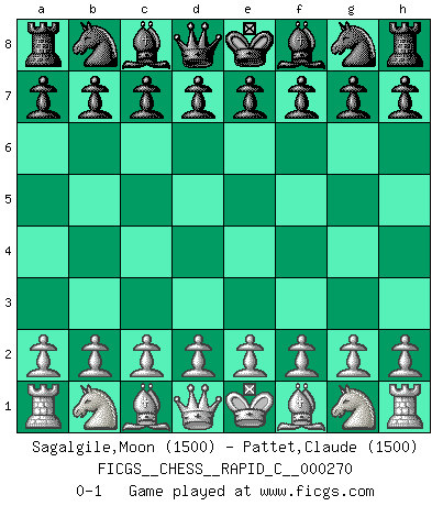 Last move : 0-1 2021 October 4 6:29:12 [Event "FICGS__CHESS__RAPID_C__000270"] [Site "FICGS"] [Date "2021.09.03"] [Round "1"] [White "Sagalgile,Moon"] [Black "Pattet,Claude"] [Result "0-1"] [WhiteElo "1500"] [BlackElo "1500"] 0-1 This chess game has been lost on time (started : 2021.09.03 22:6:8) Player Black won this chess game. Follow this game move after move (download)Chess problems demand from the composer the same virtues that characterize all worthwhile art: originality, invention, conciseness, harmony, complexity, and splendid insincerity. (Vladimir Nabokov) Zu meiner Zeit war ein 20 jähriger ein junger Spieler, heute ist er ein Veteran. (Garry Kasparov) En partidas rápidas, el Caballo es mas poderoso que el Alfil. (Vlastimil Hort) Le thème de l'attaque double intervient d'une manière ou d'une autre dans l'immense majorité des combinaisons. (Youri Averbakh) An expert is a man who has made all the mistakes which can be made in a very narrow field. (Niels Bohr)