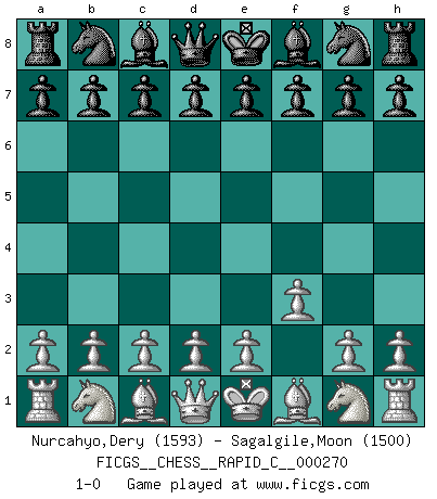 Last move : 1-0 2021 October 5 7:48:57 [Event "FICGS__CHESS__RAPID_C__000270"] [Site "FICGS"] [Date "2021.09.03"] [Round "1"] [White "Nurcahyo,Dery"] [Black "Sagalgile,Moon"] [Result "1-0"] [WhiteElo "1593"] [BlackElo "1500"] 1.f3 1-0 This chess game has been lost on time (started : 2021.09.03 22:6:8) Gedult's Opening Player White won this chess game. Follow this game move after move (download)I believe that Chess possesses a magic that is also a help in advanced age. A rheumatic knee is forgotten during a game of Chess and other events can seem quite unimportant in comparison with a catastrophe on the chessboard. (Vlastimil Hort) Ivan Sokolov treibt mich als Beifahrer an mit go Loeky go - . (Loek van Wely) Las leyes del Ajedrez no permiten una libre elección: tienes que mover quieras o no. (Emanuel Lasker) Un journaliste : 'Vous préférez avoir une dame de plus sur l'échiquier ou au lit ?' Boris Spassky : 'Ca dépend de la position.' History is the quarrels of popes and kings, with wars or pestilences in every page; the men all so good for nothing, and hardly any women at all. (Jane Austen)