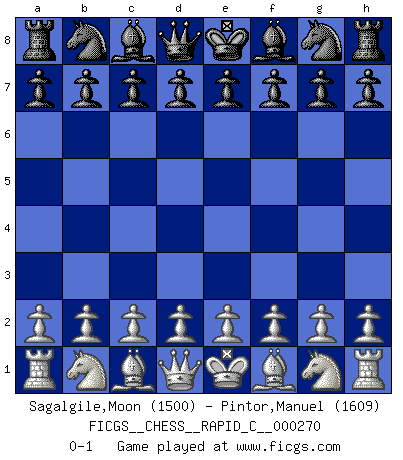 Last move : 0-1 2021 October 4 6:29:12 [Event "FICGS__CHESS__RAPID_C__000270"] [Site "FICGS"] [Date "2021.09.03"] [Round "1"] [White "Sagalgile,Moon"] [Black "Pintor,Manuel"] [Result "0-1"] [WhiteElo "1500"] [BlackElo "1609"] 0-1 This chess game has been lost on time (started : 2021.09.03 22:6:8) Player Black won this chess game. Follow this game move after move (download)Half the variations which are calculated in a tournament game turn out to be completely superfluous. Unfortunately, no one knows in advance which half. (Jan Tinman) Der 70jährige Viktor Kortschnoi: Die Rentenanstalt wollte mich zwingen in Rente zu gehen. Meine Frau erhält jetzt eine Pension- und ich zahle weiter in die Rentenkasse ein! (Viktor Kortschnoi) Siempre es mejor sacrificar los hombres de tu oponente. (Savielly Tartakower) Les échecs sont un jeu par leur forme, un art par leur essence et une science par sa difficulté d'acquisition. Ils peuvent vous procurer autant de plaisir qu'un bon livre ou une belle musique, mais vous n'aurez une réelle joie que si vous arrivez à bien jouer. (Tigran Petrosian) Tomorrow's what you make of it. (Horatio Caine, C.S.I. Miami)