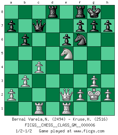 Last move : 1/2-1/2 2021 September 5 20:42:32 [Event "FICGS__CHESS__CLASS_GM__000006"] [Site "FICGS"] [Date "2021.09.05"] [Round "1"] [White "Bernal Varela,Nelson"] [Black "Kruse,Herbert"] [Result "1/2-1/2"] [WhiteElo "2494"] [BlackElo "2516"] 1.Nf3 Nf6 2.d4 e6 3.c4 b6 4.g3 Ba6 5.b3 Bb4+ 6.Bd2 Be7 7.Bg2 c6 8.Bc3 d5 9.Nbd2 Nbd7 10.O-O O-O 11.Re1 Bb7 12.e4 dxe4 13.Nxe4 c5 14.Nxf6+ Bxf6 15.Rc1 cxd4 16.Bxd4 Qc7 17.Qe2 Rad8 18.Bxf6 Nxf6 19.Ne5 Bxg2 20.Kxg2 1/2-1/2 Reti Opening Kingside Castling by player White (move 10) Kingside Castling by player Black (move 10) This chess game ended in a draw. Follow this game move after move (download)Up to this point White has been following well-known analysis. But now he makes a fatal error: he begins to use his own head. (Siegbert Tarrasch) Ihnen, Herr Lasker, habe ich nur drei Worte zu sagen: Schach und matt. (Siegbert Tarrasch) El Ajedrez es tan inspirador que yo no creo que un buen jugador sea capaz de tener un pensamiento malo durante una partida. (Wilhelm Steinitz) Toutes choses étant égales, c'est la conviction qui gagne. Alliée à une volonté de vaincre, elle sert de détonateur, suscite des idées, disperse les doutes et aide à penser clairement. (Robert Fischer) There will be no order, only chaos. (Sol Robeson in Pi by Darren Aronofsky)