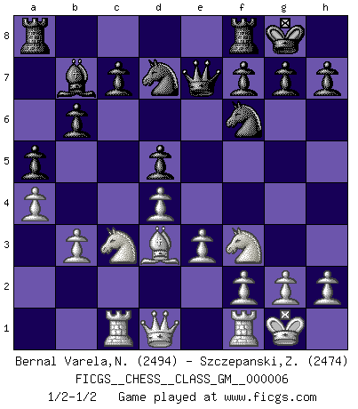 Last move : 1/2-1/2 2021 September 22 7:7:27 [Event "FICGS__CHESS__CLASS_GM__000006"] [Site "FICGS"] [Date "2021.09.05"] [Round "1"] [White "Bernal Varela,Nelson"] [Black "Szczepanski,Zbigniew"] [Result "1/2-1/2"] [WhiteElo "2494"] [BlackElo "2474"] 1.Nf3 d5 2.d4 Nf6 3.c4 e6 4.e3 Nbd7 5.Nc3 a6 6.b3 b6 7.Bd3 Bb7 8.O-O Bd6 9.a4 O-O 10.cxd5 exd5 11.Ba3 Bxa3 12.Rxa3 Qe7 13.Ra1 a5 14.Rc1 1/2-1/2 Reti Opening Kingside Castling by player White (move 8) Kingside Castling by player Black (move 9) This chess game ended in a draw. Follow this game move after move (download)Spassky will not be psyched out by Fischer. (Mike Goodall) Ich spiele ehrlich und spiele, um zu gewinnen. Wenn ich verliere nehme ich meine Medizin. (Robert James Fischer) Los tropiezos estan todos ahí en el tablero, esperando que se cometan. (Savielly Tartakover) La menace est plus forte que l'exécution. (Aaron Nimzovitch) The question of whether computers can think is just like question of whether submarines can swim. (Edsger W. Dijkstra)