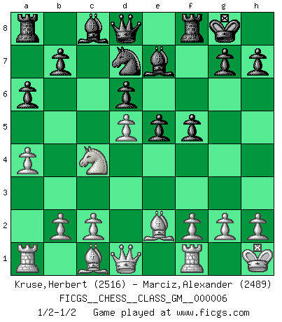 Last move : 1/2-1/2 2021 September 12 14:9:26 [Event "FICGS__CHESS__CLASS_GM__000006"] [Site "FICGS"] [Date "2021.09.05"] [Round "1"] [White "Kruse,Herbert"] [Black "Marciz,Alexander"] [Result "1/2-1/2"] [WhiteElo "2516"] [BlackElo "2489"] 1.e4 c5 2.Nf3 Nc6 3.d4 cxd4 4.Nxd4 Nf6 5.Nc3 e5 6.Ndb5 d6 7.Nd5 Nxd5 8.exd5 Nb8 9.a4 Be7 10.Be2 O-O 11.O-O Nd7 12.Kh1 a6 13.Na3 f5 14.Nc4 1/2-1/2 Sicilian : Pelikan (Lasker/Sveshnikov) variation Kingside Castling by player Black (move 10) Kingside Castling by player White (move 11) This chess game ended in a draw. Follow this game move after move (download)When you are lonely, when you feel yourself an alien in the world, play Chess. This will raise your spirits and be your counselor in war. (Aristotle) Alles was am Schachbrett zählt sind gute Züge. (Robert James Fischer) La partida mas dura de ganar es una partida ganada. (Emanuel Lasker) Les Echecs mettent en conflit, non pas deux intelligences, mais deux volontés. (Lasker) The leaves of memory seemed to make a mournful rustling in the dark. (Henry Wadsworth Longfellow)