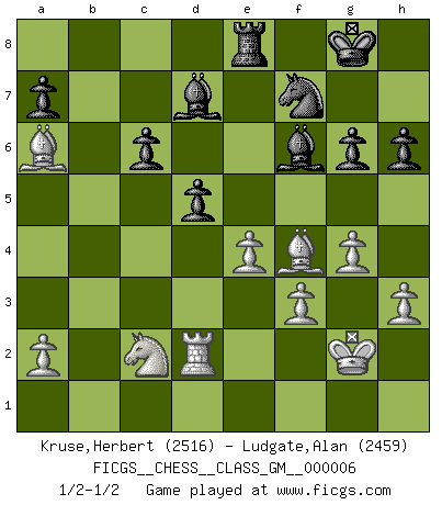 Last move : 1/2-1/2 2021 October 9 15:30:30 [Event "FICGS__CHESS__CLASS_GM__000006"] [Site "FICGS"] [Date "2021.09.05"] [Round "1"] [White "Kruse,Herbert"] [Black "Ludgate,Alan"] [Result "1/2-1/2"] [WhiteElo "2516"] [BlackElo "2459"] 1.Nf3 Nf6 2.d4 g6 3.c4 Bg7 4.Nc3 O-O 5.e4 d6 6.Be2 e5 7.O-O exd4 8.Nxd4 Re8 9.f3 Nc6 10.Be3 Nh5 11.Nc2 Be5 12.g3 f5 13.Nd5 Bxb2 14.Rb1 Bg7 15.g4 f4 16.Bc1 Nf6 17.Bxf4 Ne5 18.Qd2 Nxd5 19.cxd5 c5 20.dxc6 bxc6 21.Nd4 Bd7 22.Kg2 Rb8 23.Rfd1 d5 24.Rxb8 Qxb8 25.Nc2 Qb2 26.Ne3 Qxd2 27.Rxd2 Nf7 28.Ba6 Bf6 29.h3 h6 30.Nc2 1/2-1/2 Reti Opening Kingside Castling by player Black (move 4) Kingside Castling by player White (move 7) This chess game ended in a draw. Follow this game move after move (download)In complicated positions, Bobby Fischer hardly had to be afraid of anybody. (Paul Keres) Wer nie einen Fehler gemacht hat, hat nie etwas Neues ausprobiert. (Albert Einstein) El Ajedrez es un juego de pelea el cual es puramente intelectual e incluye la suerte. (Richard Reti) Les écrivains ont utilisé les échecs pour analyser les côtés extrêmes de la nature humaine. Dans ce cadre, les échecs offrent un champ d'expérimentation idéal. Mais on pourrait faire la même chose avec la peinture. Et là, en vous référant à Van Gogh, vous ne tirerez pas de conclusion définitive sur les peintres. (Gary Kasparov) Games, world of games... There's always an opponent, and there's always a victim. (Revolver, movie)