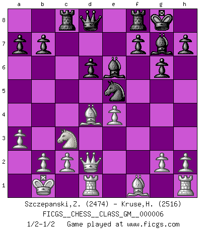 Last move : 1/2-1/2 2021 September 11 13:17:37 [Event "FICGS__CHESS__CLASS_GM__000006"] [Site "FICGS"] [Date "2021.09.05"] [Round "1"] [White "Szczepanski,Zbigniew"] [Black "Kruse,Herbert"] [Result "1/2-1/2"] [WhiteElo "2474"] [BlackElo "2516"] 1.e4 c5 2.Nc3 d6 3.f4 Nc6 4.Nf3 g6 5.d4 cxd4 6.Nxd4 Nf6 7.Be3 Ng4 8.Bg1 e5 9.fxe5 Ngxe5 10.Qd2 Bg7 11.O-O-O O-O 12.Kb1 Nxd4 13.Bxd4 Be6 14.a3 Rc8 1/2-1/2 Sicilian : Closed Queenside Castling by player White (move 11) Kingside Castling by player Black (move 11) This chess game ended in a draw. Follow this game move after move (download)That's what Chess is all about. One day you give your opponent a lesson, the next day he gives you one. (Bobby Fischer) Moralische Siege zählen nicht. (Savielly Grigorievitsch Tartakower) El hombre es un frívolo, una creatura engañosa y como un jugador de Ajedrez, se preocupa mas por el proceso de obtener su meta que de la meta por sí misma. (Dostoyevsky) Si je n'étais pas joueur d'échecs, je serais le meilleur dans quelque chose d'autre. (Anatoli Karpov) God, you are such an idiot. - Actually, I thought I was more of a jerk. (Gregory House to Stacy Warner, House M.D.)