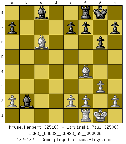 Last move : 1/2-1/2 2021 September 11 10:19:4 [Event "FICGS__CHESS__CLASS_GM__000006"] [Site "FICGS"] [Date "2021.09.05"] [Round "1"] [White "Kruse,Herbert"] [Black "Larwinski,Paul"] [Result "1/2-1/2"] [WhiteElo "2516"] [BlackElo "2508"] 1.Nf3 Nf6 2.g3 g6 3.c4 Bg7 4.d4 O-O 5.Nc3 d5 6.cxd5 Nxd5 7.Bg2 c5 8.O-O Nxc3 9.bxc3 cxd4 10.Nxd4 Nc6 11.Nxc6 bxc6 12.Qxd8 Rxd8 13.Bxc6 Rb8 14.Bf4 Rb2 15.Rad1 Rf8 16.Rd2 Bxc3 17.Rxb2 Bxb2 1/2-1/2 Reti : King's Indian attack Kingside Castling by player Black (move 4) Kingside Castling by player White (move 8) This chess game ended in a draw. Follow this game move after move (download)Chess mastery essentially consists of analyzing Chess positions accurately. (Mikhail Botvinnik) Ich war zu klein für die Schach-Schülermannschaft! (Woody Allen) Bendita sea la memoria de aquel que dio al mundo este juego inmortal. (A. G. Gardiner) L'attaque fait le spectacle, la défense gagne les matchs. (Dicton footballistique) History is a gallery of pictures in which there are few originals and many copies. (Alexis de Tocqueville)