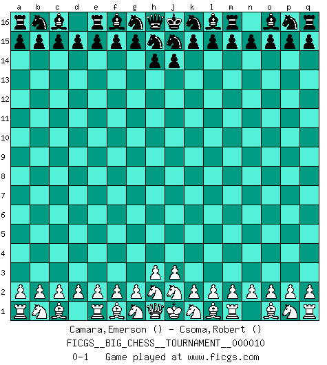 Last move : 0-1 2007 August 15 15:42:3 [Event "FICGS__BIG_CHESS__TOURNAMENT__000010"] [Site "FICGS"] [Date "2007.07.16"] [Round "1"] [White "Camara,Emerson"] [Black "Csoma,Robert"] [Result "0-1"] [WhiteElo ""] [BlackElo ""] 0-1 This big chess game has been lost on time (started : 2007.07.16 14:44:43) Follow this game move after move (download)The most important feature of the Chess position is the activity of the pieces. This is absolutely fundamental in all phases of the game: Opening, Middlegame and especially Endgame. The primary constraint on a piece's activity is the Pawn structure. (Michael Stean) Kleine Schachspieler machen Mist, und große Schachspieler machen Mist, aber große machen weniger Mist. (Fritz Sämisch) No soy una persona materialista y por eso, no resiento la falta o pérdida del dinero. La ausencia de cosas mundanas carece de importancia. Ya que el Ajedrez es una forma en la que puedo ser tan materialista como yo desee sin tener la necesidad de vender mi alma. (Jamie Walter Adams) Ce qui est bien, c'est d'avoir tout un tas de pièces en prise : l'adversaire ne peut en prendre qu'une à la fois. Cité par Thierry Audin. If only faces could talk... (Pat Summerall, Sportscaster during the Super Bowl)