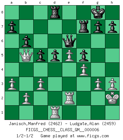 Last move : 1/2-1/2 2021 September 14 17:13:51 [Event "FICGS__CHESS__CLASS_GM__000006"] [Site "FICGS"] [Date "2021.09.05"] [Round "1"] [White "Janisch,Manfred"] [Black "Ludgate,Alan"] [Result "1/2-1/2"] [WhiteElo "2462"] [BlackElo "2459"] 1.e4 e5 2.Nf3 Nf6 3.Nxe5 d6 4.Nf3 Nxe4 5.d4 d5 6.Bd3 Be7 7.O-O Nc6 8.Nbd2 Nxd2 9.Bxd2 Bg4 10.c3 O-O 11.h3 Bh5 12.g3 Qd7 13.Kg2 Bg6 14.Bf4 Be4 15.Re1 f5 16.Kh2 Bd6 17.Ne5 Qe7 18.f3 Bxe5 19.Bxe5 Nxe5 20.dxe5 Bxd3 21.Qxd3 Rad8 22.f4 c5 23.Re2 b6 24.Rd1 Qe6 25.a3 Rf7 26.Qb5 1/2-1/2 Petrov : Classical attack Kingside Castling by player White (move 7) Kingside Castling by player Black (move 10) This chess game ended in a draw. Follow this game move after move (download)A sacrifice is best refuted by accepting it. (Wilhelm Steinitz) Wenn Dein Gegner dir ein Remis anbietet, versuch herauszufinden, weshalb er glaubt schlechter zu stehen. (Nigel Short) El Ajedrez es tan inspirador que yo no creo que un buen jugador sea capaz de tener un pensamiento malo durante una partida. (Wilhelm Steinitz) Le temps de noter son nom sur la feuille de partie, j'étais déjà en zeitnot ! D'un modeste amateur apparié lors de la première ronde d'un open contre le grand-maître Azmaïparashvili. If you have any trouble condescending, find a Unix user to show you how it's done. (Scott Adams)