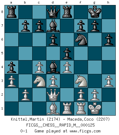 Last move : 0-1 2021 November 21 5:17:28 [Event "FICGS__CHESS__RAPID_M__000125"] [Site "FICGS"] [Date "2021.09.05"] [Round "1"] [White "Knittel,Martin"] [Black "Maceda,Coco"] [Result "0-1"] [WhiteElo "2174"] [BlackElo "2207"] 1.c4 e5 2.Nc3 Nf6 3.Nf3 Nc6 4.e4 Bb4 5.d3 d6 6.h3 O-O 7.Be2 Bc5 8.O-O a5 9.Be3 Re8 10.Qd2 Bd7 11.a3 h6 12.Rae1 Nd4 13.Bd1 a4 14.Bxd4 Bxd4 0-1 This chess game has been lost on time (started : 2021.09.05 16:27:41) English Opening Kingside Castling by player Black (move 6) Kingside Castling by player White (move 8) Player Black won this chess game. Follow this game move after move (download)Who is your opponent tonight, tonight I am playing against the Black pieces. (Akiba Rubinstein) Der Partner hat auch seine Existenzberechtigung. (Savielly Grigorievitsch Tartakower) El Ajedrez es un mar en el cual un mosquito puede beber y un elefante puede bañarse. (Refrán Hindú) Le jeu d'échecs fait naître et fortifie en nous plusieurs qualités précieuses dans le cours de l'existence, telles que la prévoyance, la circonspection, la prudence, et la persévérance. (Benjamin Franklin - 1783, la morale des échecs) I can't decide which is riskier; taking crazy risks, or taking advice on crazy risks from a crazy risk taker. (Gregory House in House M.D.)