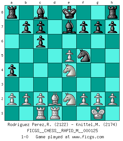 Last move : 1-0 2021 November 21 5:17:28 [Event "FICGS__CHESS__RAPID_M__000125"] [Site "FICGS"] [Date "2021.09.05"] [Round "1"] [White "Rodriguez Perez,Rene"] [Black "Knittel,Martin"] [Result "1-0"] [WhiteElo "2122"] [BlackElo "2174"] 1.e4 e5 2.Nf3 Nc6 3.Bb5 Nf6 4.O-O Nxe4 5.d4 Nd6 6.Bxc6 dxc6 7.dxe5 Nf5 8.Qxd8+ Kxd8 9.Rd1+ Ke8 10.Nbd2 Be7 11.Ne4 Nh4 12.Nd4 Nf5 13.Ne2 a5 14.Bd2 a4 15.Rac1 1-0 This chess game has been lost on time (started : 2021.09.05 16:27:41) Ruy Lopez : Berlin defense, Open variation Kingside Castling by player White (move 4) Player White won this chess game. Follow this game move after move (download)Chess teaches you to control the initial excitement you feel when you see something that looks good and it trains you to think objectively when you're in trouble. (Stanley Kubrick) Ein typischer, sehr verbreiteter Gedankenschädling ist der, daß der betreffende Amateur von der Annanhme ausgeht, daß jeder einzelne Zug etwas zu leisten habe. (Aaron Nimzowitsch) El Ajedrez no es una pizca de inferior al violín, y tenemos un gran número de violinistas profesionales. (Mikhail Botvinnik) J'ai vu le vaincu d'Echecs jouer des années durant dans l'espoir de la fête de la victoire. Car tu es plus riche de ce qu'elle existe si même elle n'est point pour toi. Ainsi de la perle du fond des mers. (Antoine de Saint-Exupéry) Mac users swear by their computers. PC users swear at their computers. (Author unknown)