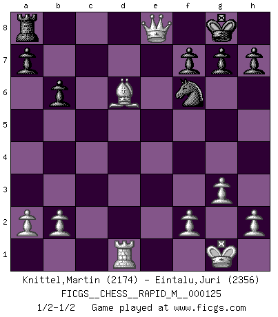 Last move : 1/2-1/2 2021 November 11 4:20:15 [Event "FICGS__CHESS__RAPID_M__000125"] [Site "FICGS"] [Date "2021.09.05"] [Round "1"] [White "Knittel,Martin"] [Black "Eintalu,Juri"] [Result "1/2-1/2"] [WhiteElo "2174"] [BlackElo "2356"] 1.Nf3 d5 2.d4 Nf6 3.c4 e6 4.g3 Be7 5.Bg2 O-O 6.O-O Nbd7 7.Qc2 c6 8.Nbd2 b6 9.e4 dxc4 10.Nxc4 Bb7 11.Bf4 c5 12.Rfe1 cxd4 13.Nd6 d3 14.Qxd3 Bxd6 15.Bxd6 Bxe4 16.Qd4 e5 17.Qa4 Re8 18.Rad1 Bxf3 19.Bxf3 e4 20.Bxe4 Nxe4 21.Rxe4 Nf6 22.Rxe8+ Qxe8 23.Qxe8+ 1/2-1/2 Reti Opening Kingside Castling by player Black (move 5) Kingside Castling by player White (move 6) This chess game ended in a draw. Follow this game move after move (download)The passed Pawn is a criminal, who should be kept under lock and key. Mild measures, such as police surveillance, are not sufficient. (Aaron Nimzovich) Der vorletzte Fehler gewinnt. (Savielly Grigorievitsch Tartakower) En la perfecta combinación de Ajedrez como en una historia corta de primera clase, toda la trama y contra trama deberá conducir hacia un final sorprendente, el interes no es mitigado hasta el último momento. (Yates and Winter) A ce moment-là, je menaçais de comprendre la position ! (Clément L'Heureux) A government big enough to give you everything you want is strong enough to take everything you have. (Thomas Jefferson)