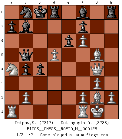 Last move : 1/2-1/2 2021 October 20 16:29:48 [Event "FICGS__CHESS__RAPID_M__000125"] [Site "FICGS"] [Date "2021.09.05"] [Round "1"] [White "Osipov,Sergey"] [Black "Duttagupta,Aniruddha"] [Result "1/2-1/2"] [WhiteElo "2212"] [BlackElo "2225"] 1.d4 d5 2.c4 c6 3.Nf3 Nf6 4.Nc3 e6 5.Bg5 dxc4 6.e4 b5 7.e5 h6 8.Bh4 g5 9.Nxg5 hxg5 10.Bxg5 Nbd7 11.exf6 Bb7 12.g3 Qb6 13.Bg2 O-O-O 14.O-O c5 15.d5 b4 16.Na4 Qb5 17.a3 Nb8 18.axb4 cxb4 19.Qg4 1/2-1/2 QGD Slav : 4.Nc3 Queenside Castling by player Black (move 13) Kingside Castling by player White (move 14) This chess game ended in a draw. Follow this game move after move (download)The Pin is mightier than the sword. (Fred Reinfeld) Du musst Deinen Gegner in einen tiefen dunklen Wald führen wo 2+2=5 ist und wo der Weg, der wieder hinausführt, nur breit genug für einen ist. (Mikhail Nekhemyevich Tal) En el Ajedrez, tal como en la vida, las bendiciones de hoy pueden ser el veneno del mañana. (Assaic) La vie et les Echecs sont tous les deux une lutte constante. (Lasker) Heh, heh, heh. Time to abandon ship. (General Grievous in Star Wars ep.3)