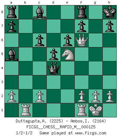Last move : 1/2-1/2 2021 October 19 20:47:32 [Event "FICGS__CHESS__RAPID_M__000125"] [Site "FICGS"] [Date "2021.09.05"] [Round "1"] [White "Duttagupta,Aniruddha"] [Black "Ambos,Ilmar"] [Result "1/2-1/2"] [WhiteElo "2225"] [BlackElo "2164"] 1.d4 Nf6 2.Nf3 d5 3.Bf4 c5 4.e3 Nc6 5.Nbd2 Qb6 6.dxc5 Qxb2 7.Rb1 Qc3 8.Bb5 e6 9.e4 Bxc5 10.O-O O-O 11.Bxc6 bxc6 12.Be5 Qa5 13.Nb3 Qb4 14.Bxf6 gxf6 15.e5 fxe5 16.Nxe5 Bb6 17.Na5 Qd4 18.Qh5 Bxa5 19.Qg5+ Kh8 20.Qf6+ 1/2-1/2 Queen's pawn game Kingside Castling by player White (move 10) Kingside Castling by player Black (move 10) This chess game ended in a draw. Follow this game move after move (download)I play correspondence chess because it is both art and science while chess is art only. (A player at FICGS) Die Jungen erwarten, dass Opa einfach umfällt. Dann aber kann Opa fünf Stunden lang Schach spielen und die jungen Gegner an die Wand drücken. (Viktor Kortschnoi) Estaba muy claro de que el punto vulnerable del Gran Maestro Americano (Bobby Fischer) radicaba en las posiciones de doble filo, colgantes, irracionales, donde el siempre falló en encontrar un triunfo aún en una posición de clara victoria. (Efim Geller) Le temps de noter son nom sur la feuille de partie, j'étais déjà en zeitnot ! D'un modeste amateur apparié lors de la première ronde d'un open contre le grand-maître Azmaïparashvili. I have opinions of my own - strong opinions - but I don't always agree with them. (George Bush)