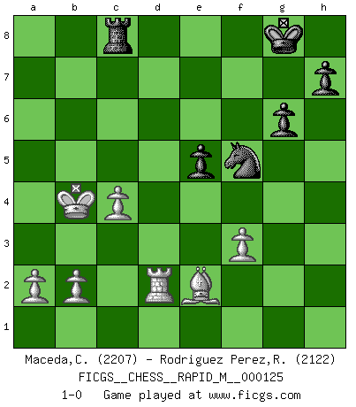 Last move : 1-0 2021 December 9 0:50:45 [Event "FICGS__CHESS__RAPID_M__000125"] [Site "FICGS"] [Date "2021.09.05"] [Round "1"] [White "Maceda,Coco"] [Black "Rodriguez Perez,Rene"] [Result "1-0"] [WhiteElo "2207"] [BlackElo "2122"] 1.e4 e6 2.d4 d5 3.Nc3 Nf6 4.e5 Nfd7 5.f4 c5 6.Nf3 cxd4 7.Nxd4 Nc6 8.Be3 a6 9.Qd2 Nxd4 10.Bxd4 Qc7 11.O-O-O b5 12.Kb1 Bc5 13.h4 O-O 14.h5 Bb7 15.Ne2 Rae8 16.Ng1 Qb6 17.Nf3 Bxd4 18.Nxd4 f6 19.h6 g6 20.Nf3 fxe5 21.fxe5 d4 22.Qxd4 Qxd4 23.Rxd4 Rd8 24.c4 b4 25.Be2 Bxf3 26.gxf3 Nxe5 27.Rhd1 Rxd4 28.Rxd4 a5 29.Kc2 Nf7 30.Kb3 Rc8 31.Ka4 Nxh6 32.Kxa5 Nf5 33.Rd2 e5 34.Kxb4 1-0 French : Steinitz variation Queenside Castling by player White (move 11) Kingside Castling by player Black (move 13) Player White won this chess game. Follow this game move after move (download)Chess books should be used as we use glasses: to assist the sight, although some players make use of them as if they thought they conferred sight. (Jose Raul Capablanca) Schach ist Leben. (Robert James Fischer) La única cosa que los jugadores de Ajedrez tienen en común, es el Ajedrez. (Lodewijk Prins) C'est la seule position que je connaisse où les deux camps sont mals. Propos prêtés à V. Anand. Begin at the beginning and go on till you come to the end; then stop. (Lewis Carrol, Alice in Wonderland)