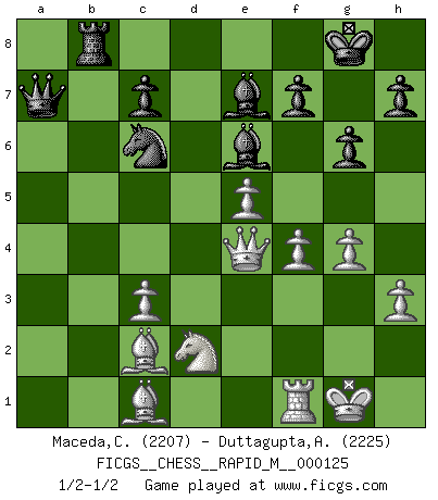 Last move : 1/2-1/2 2021 November 24 1:47:45 [Event "FICGS__CHESS__RAPID_M__000125"] [Site "FICGS"] [Date "2021.09.05"] [Round "1"] [White "Maceda,Coco"] [Black "Duttagupta,Aniruddha"] [Result "1/2-1/2"] [WhiteElo "2207"] [BlackElo "2225"] 1.e4 e5 2.Nf3 Nc6 3.Bb5 a6 4.Ba4 Nf6 5.O-O Nxe4 6.d4 b5 7.Bb3 d5 8.dxe5 Be6 9.Nbd2 Nc5 10.c3 Be7 11.Bc2 d4 12.Nb3 d3 13.Bb1 Nxb3 14.axb3 Bf5 15.b4 O-O 16.h3 Bg6 17.Nd2 a5 18.f4 Bf5 19.g4 Be6 20.Qf3 axb4 21.Rxa8 Qxa8 22.Qxd3 g6 23.Qxb5 Rb8 24.Qd3 bxc3 25.bxc3 Qa1 26.Bc2 Qa2 27.Qe4 Qa7+ 1/2-1/2 Ruy Lopez : Open, 7.Bb3 Kingside Castling by player White (move 5) Kingside Castling by player Black (move 15) This chess game ended in a draw. Follow this game move after move (download)We cannot resist the fascination of sacrifice, since a passion for sacrifices is part of a Chessplayer's nature. (Rudolf Spielman) Schach ist das Spiel, das die Verrückten gesund hält. (Albert Einstein) Juega la Apertura como un libro, el Juego Medio como un mago y los Finales como una máquina. (Spielmann) À la honte des hommes, on sait que les lois du jeu sont les seules qui soient partout justes, claires, inviolables et exécutées. Pourquoi l'Indien qui a donné les règles du jeu d'échecs est-il obéi de bon gré dans toute la terre, et que les décrétales des papes, par exemple, sont aujourd'hui un objet d'horreur et de mépris ? C'est que l'inventeur des échecs combina tout avec justesse pour la satisfaction des joueurs, et que les papes, dans leurs décrétales, n'eurent en vue que leur seul avantage. L'Indien voulut exercer également l'esprit des hommes et leur donner du plaisir; les papes ont voulu abrutir l'esprit des hommes. Voltaire (Dictionnaire philosophique / Garnier 1967) Every vice is only an exaggeration of a necessary and virtuous function. (Ralph Waldo Emerson, Journals 1936)