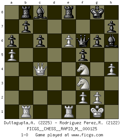 Last move : 1-0 2021 December 9 0:59:6 [Event "FICGS__CHESS__RAPID_M__000125"] [Site "FICGS"] [Date "2021.09.05"] [Round "1"] [White "Duttagupta,Aniruddha"] [Black "Rodriguez Perez,Rene"] [Result "1-0"] [WhiteElo "2225"] [BlackElo "2122"] 1.d4 f5 2.Bg5 g6 3.Nc3 Bg7 4.e3 d5 5.h4 c6 6.Nf3 Nf6 7.Bd3 Nbd7 8.Ne2 Qb6 9.O-O Qxb2 10.a4 Qb4 11.c4 dxc4 12.Rb1 Qd6 13.Bxc4 Nb6 14.Bb3 Nbd5 15.a5 e6 16.Qc2 O-O 17.Rfc1 a6 18.Ng3 Qc7 19.Qa2 Kh8 20.Ne2 Ne4 21.Bf4 Qe7 22.Be5 Rf7 23.Qa1 Kg8 24.Nf4 Bf8 25.Bc2 Bh6 26.Re1 Nef6 27.Nh3 Ng4 28.e4 Nb4 29.Qa4 Nxc2 30.Qxc2 Nxe5 31.dxe5 Rf8 32.exf5 exf5 33.e6 Re8 34.Qa4 Rb8 35.Nf4 Qf6 36.Qc4 1-0 Dutch, 2.Bg5 variation Kingside Castling by player White (move 9) Kingside Castling by player Black (move 16) Player White won this chess game. Follow this game move after move (download)It is always better to sacrifice your opponent's men. (Savielly Tartakower) Ich bin der einzige Schachspieler, der sich während der Vorbereitungen zum Turnier verletzt hat. (Woody Allen) Yo creo que el Ajedrez posee una magia que es también una ayuda en la edad avanzada. Una rodilla reumática es olvidada durante una partida de Ajedrez y otros eventos pueden parecer algo sin importancia comparada a una catástrofe en el tablero de Ajedrez. (Vlastimil Hort) Vous savez, camarade Pachman, je n'éprouve pas de plaisir à être ministre, je jouerais plutôt aux échecs comme vous, ou alors ferais une révolution au Venezuela. (Che Guevara à Ludek Pachman, 'Checkmate in Prague', 1975) I think your argument is specious - I think your tie is ugly. (Gregory House to Dr. Foreman, House M.D.)