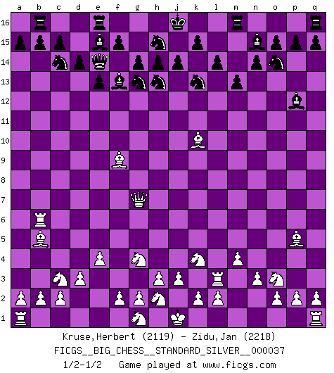 Last move : 1/2-1/2 2021 November 4 10:41:35 [Event "FICGS__BIG_CHESS__STANDARD_SILVER__000037"] [Site "FICGS"] [Date "2021.09.07"] [Round "1"] [White "Kruse,Herbert"] [Black "Zidu,Jan"] [Result "1/2-1/2"] [WhiteElo "2119"] [BlackElo "2218"] 1.j2-k4 h15-g13 2.h1-o7 m15-m13 3.m2-m4 b16-c14 4.l1-p5 g15-g14 5.b1-c3 p16-o14 6.e2-e4 h16-f14 7.h2-g4 l16-p12 8.k1-h2 j15-k13 9.f1-b5 g16-j15 10.d2-d3 k16-h15 11.c1-l9 d15-d14 12.n2-n3 c16-l8 13.e1-e3 e15-e13 14.e3-f3 f14-e14 15.p1-o3 n15-n14 16.o1-f9 l15-l14 17.m1-m3 j15-h13 18.m3-l3 l8-f13 19.l9-k10 o16-n15 20.f3-f6 f16-e15 21.f6-b6 a16-b16 22.o7-p7 n15-k12 23.p7-g7 k12-n15 24.g7-p7 n15-k12 25.p7-g7 k12-n15 1/2-1/2 Follow this game move after move (download)When you don't know what to do, wait for your opponent to get an idea - it's sure to be wrong. (Tarrasch) Es ist peinlich, dass ich nie Weltmeister wurde. Es wäre leicht, Leonid Breschnjew als Ursache vorzuschieben, dessen Apparat den Vorzeigekommunisten Anatoli Karpow in allem unterstützte. Aber Garri Kasparow zum Beispiel, der ebenfalls von den Sowjets unerwünscht war, hat trotz der Widerstände den WM-Titel erobert. (Viktor Kortschnoi) El Ajedrez es imaginación. (David Bronstein) La victoire dans une partie d'Echecs appartient la plupart du temps à celui qui voit un peu plus loin que l'adversaire. (Lasker) Now be brave and don't look back. Don't look back. (Shmi Skywalker in Star Wars ep.1)