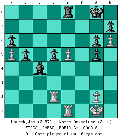 Last move : 1-0 2022 February 28 2:58:54 [Event "FICGS__CHESS__RAPID_GM__000016"] [Site "FICGS"] [Date "2021.09.10"] [Round "1"] [White "Lounek,Jan"] [Black "Wosch,Arkadiusz"] [Result "1-0"] [WhiteElo "2497"] [BlackElo "2414"] 1.e4 c5 2.Nf3 Nc6 3.Bb5 g6 4.O-O Bg7 5.Re1 Nf6 6.Bxc6 dxc6 7.d3 O-O 8.h3 Ne8 9.e5 Nc7 10.Be3 b6 11.Qd2 Ne6 12.a4 Nd4 13.Nxd4 cxd4 14.Bh6 c5 15.Qf4 Qc7 16.Nd2 Bb7 17.h4 Rac8 18.f3 Qd7 19.a5 b5 20.Nf1 Bd5 21.Ng3 Kh8 22.Bg5 Kg8 23.h5 Rc6 24.Bh6 Kh8 25.Bxg7+ Kxg7 26.h6+ Kg8 27.Re2 Qc7 28.Qg5 Kh8 29.Rae1 Qd8 30.Kf2 Re6 31.Ra1 Ra6 32.R2e1 Rc6 33.b3 Be6 34.Nh5 Rg8 35.Ng3 a6 36.Ne4 Qc7 37.Re2 Bf5 38.Nd6 Be6 39.Rae1 Rf8 40.Ne4 Rc8 41.Kg1 Rf8 42.f4 Bd5 43.Nf2 c4 44.b4 cxd3 45.cxd3 Rc3 46.Rd2 Bb7 47.Kh2 Re8 48.Qg3 Qc8 49.Nh3 Rf8 50.Qf2 Kg8 51.Qxd4 Rd8 52.Qe3 Bd5 53.Ng5 Qg4 54.Qg3 Qf5 55.Ne4 Qh5+ 56.Kg1 Rb3 57.Nc5 Rxb4 58.Qg5 Qxg5 59.fxg5 Rg4 60.d4 Ra8 61.Rc1 Bc4 62.d5 Rxg5 63.Nd7 Re8 64.d6 f6 65.Nc5 exd6 66.Ne4 d5 67.Nxg5 fxg5 68.Re1 1-0 Sicilian : Nimzovich-Rossolimo attack (with ...g6, without ...d6) Kingside Castling by player White (move 4) Kingside Castling by player Black (move 7) Player White won this chess game. Follow this game move after move (download)The chessboard is the world, the pieces are the phenomena of the Universe, the rules of the game are what we call the laws of Nature and the player on the other side is hidden from us. (Thomas Huxley) Es ist schade, dass viele Schachsportler vergessen, wie wichtig Auftreten und angemessene Kleidung sind. (Alexandra Kosteniuk) Los errores estan ahí, esperando a que se cometan. (Savielly Tartakower) Vous n'êtes pas toujours obligé de jouer le meilleur coup. Un coup doit être actif, entreprenant, correct et beau ! (David Bronstein) Whatever you do, don't be bored. This is absolutely the most exciting time we could have possibly hoped to be alive. And things are just starting. (From movie Waking life)