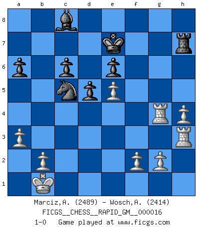 Last move : 1-0 2022 January 2 5:4:58 [Event "FICGS__CHESS__RAPID_GM__000016"] [Site "FICGS"] [Date "2021.09.10"] [Round "1"] [White "Marciz,Alexander"] [Black "Wosch,Arkadiusz"] [Result "1-0"] [WhiteElo "2489"] [BlackElo "2414"] 1.e4 c5 2.Nf3 Nc6 3.d4 cxd4 4.Nxd4 Nf6 5.Nc3 d6 6.Bg5 e6 7.Qd2 a6 8.Nxc6 bxc6 9.O-O-O h6 10.Bf4 d5 11.Qe3 Bb4 12.Be2 O-O 13.e5 Nd7 14.Qg3 Qc7 15.Na4 Re8 16.Bh5 Ra7 17.Rd3 Rb7 18.Re3 Kf8 19.c3 Nc5 20.cxb4 Nxa4 21.Bxh6 gxh6 22.Bxf7 Qxf7 23.Rf3 Rxb4 24.a3 Re4 25.Qg6 Re7 26.h4 Nc5 27.Kb1 Rf4 28.Qxh6+ Ke8 29.Rxf4 Qh7+ 30.Qxh7 Rxh7 31.Rg4 Ke7 32.Rh3 1-0 Sicilian defense Queenside Castling by player White (move 9) Kingside Castling by player Black (move 12) Player White won this chess game. Follow this game move after move (download)You know you're going to lose. Even when I was ahead I knew I was going to lose. - On playing against Fischer. (Andrew Soltis) Ich bin es gewohnt, das die Jugend mir überhaupt keinen Respekt entgegenbringt. (Alexander Morozewich) La estratégia requiere pensar, la táctica requiere observación. (Max Euwe) Même si vous avez un bon coup à faire, regardez toujours s'il n'y en a pas un qui lui soit préférable. (Pedro Damiano) History is the quarrels of popes and kings, with wars or pestilences in every page; the men all so good for nothing, and hardly any women at all. (Jane Austen)