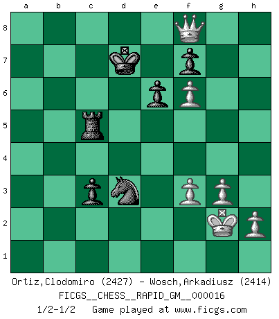 Last move : 1/2-1/2 2021 December 26 2:22:5 [Event "FICGS__CHESS__RAPID_GM__000016"] [Site "FICGS"] [Date "2021.09.10"] [Round "1"] [White "Ortiz,Clodomiro"] [Black "Wosch,Arkadiusz"] [Result "1/2-1/2"] [WhiteElo "2427"] [BlackElo "2414"] 1.d4 Nf6 2.c4 e6 3.Nf3 d5 4.Nc3 c6 5.Bg5 dxc4 6.e4 b5 7.e5 h6 8.Bh4 g5 9.Nxg5 hxg5 10.Bxg5 Nbd7 11.exf6 Bb7 12.g3 Qb6 13.Bg2 O-O-O 14.O-O c5 15.d5 b4 16.Na4 Qa6 17.a3 Bxd5 18.Bxd5 Ne5 19.Qe2 Rxd5 20.axb4 cxb4 21.Nc3 Qd6 22.Nxd5 Qxd5 23.f3 Nd3 24.Be3 Bc5 25.Bxc5 Qxc5+ 26.Kh1 Rd8 27.Ra4 a5 28.Rfa1 Rd5 29.Rxa5 Qxa5 30.Rxa5 Rxa5 31.Kg2 Rc5 32.Qe4 c3 33.Qa8+ Kd7 34.bxc3 bxc3 35.Qf8 1/2-1/2 Queen's pawn game Queenside Castling by player Black (move 13) Kingside Castling by player White (move 14) This chess game ended in a draw. Follow this game move after move (download)An attack on the wing should be met by play in the center. (Nimzovitch) Ich bin Weltmeister und muß mit niemandem irgend etwas diskutieren. (Viswanathan Anand) Te sientas frente a un tablero y repentinamente tu corazón brinca. Tu mano tiembla al tomar una pieza y moverla. Pero lo que el Ajedrez te enseña es que tu debes permanecer ahí con calma y pensar de que si realmente es una buena idea o de que si hay otras ideas mejores. (Stanley Kubrick) RxDa4 pat (...) Don't be discouraged. It's often the last key in the bunch that opens the lock. (Author unknown)