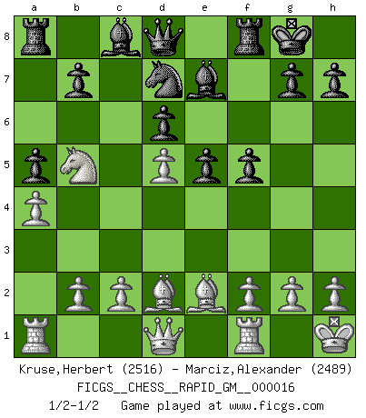 Last move : 1/2-1/2 2021 September 13 14:34:0 [Event "FICGS__CHESS__RAPID_GM__000016"] [Site "FICGS"] [Date "2021.09.10"] [Round "1"] [White "Kruse,Herbert"] [Black "Marciz,Alexander"] [Result "1/2-1/2"] [WhiteElo "2516"] [BlackElo "2489"] 1.e4 c5 2.Nf3 Nc6 3.d4 cxd4 4.Nxd4 Nf6 5.Nc3 e5 6.Ndb5 d6 7.Nd5 Nxd5 8.exd5 Nb8 9.a4 Be7 10.Be2 O-O 11.O-O Nd7 12.Bd2 a6 13.Na3 a5 14.Nb5 f5 15.Kh1 1/2-1/2 Sicilian : Pelikan (Lasker/Sveshnikov) variation Kingside Castling by player Black (move 10) Kingside Castling by player White (move 11) This chess game ended in a draw. Follow this game move after move (download)There are two classes of men; those who are content to yield to circumstances and who play whist; those who aim to control circumstances, and who play Chess. (Mortimer Collins) Ein unbeabsichtigtes Patt ist der Gipfel der Dummheit. (Anonymous) La señal de un Gran Maestro es su habilidad de ganar una partida rápidamente y sin dolor. (Irving Chernev) Les sacrifices démontrent seulement que quelqu'un a gaffé. (Savielly Tartacover) Rules and bones are meant to be broken. (Anonymous)