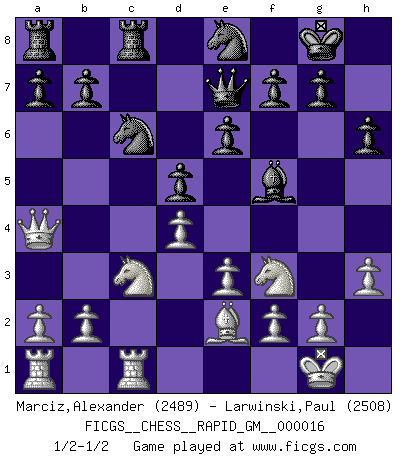 Last move : 1/2-1/2 2021 September 12 14:50:50 [Event "FICGS__CHESS__RAPID_GM__000016"] [Site "FICGS"] [Date "2021.09.10"] [Round "1"] [White "Marciz,Alexander"] [Black "Larwinski,Paul"] [Result "1/2-1/2"] [WhiteElo "2489"] [BlackElo "2508"] 1.d4 d5 2.Nf3 Nf6 3.Bf4 Bf5 4.c4 e6 5.e3 Bd6 6.Bxd6 cxd6 7.Nc3 dxc4 8.Bxc4 O-O 9.O-O d5 10.Be2 Nc6 11.h3 h6 12.Qb3 Qe7 13.Rfc1 Rfc8 14.Qa4 Ne8 1/2-1/2 Queen's Bishop game Kingside Castling by player Black (move 8) Kingside Castling by player White (move 9) This chess game ended in a draw. Follow this game move after move (download)You are for me the Queen on d8 and I am the Pawn on d7 !! (Eduard Gufeld) Ein Großmeister muß tausende Partien in seinem Kopf speichern, denn diese sind für Ihn, was die Worte der Muttersprache für gewöhnliche Leute sind, oder Noten für Musiker... (Garry Kasparov) El Ajedrez te enseña a controlarl la excitación inicial que sientes cuando vez algo que parece bueno y te enseña a pensar objetivamente cuando te encuentras en problemas. (Stanley Kubrick) La victoire dans une partie d'Echecs appartient la plupart du temps à celui qui voit un peu plus loin que l'adversaire. (Lasker) The only thing that overcomes hard luck is hard work. (Harry Golden)