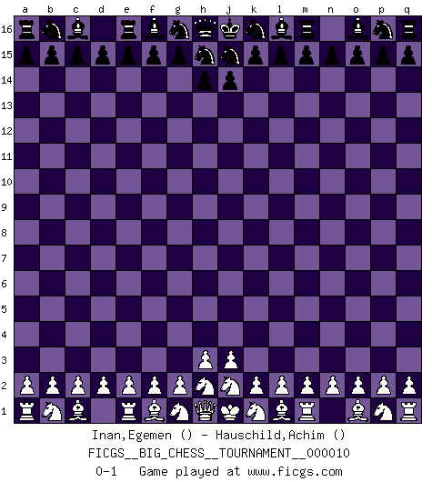 Last move : 0-1 2007 August 15 15:42:3 [Event "FICGS__BIG_CHESS__TOURNAMENT__000010"] [Site "FICGS"] [Date "2007.07.16"] [Round "1"] [White "Inan,Egemen"] [Black "Hauschild,Achim"] [Result "0-1"] [WhiteElo ""] [BlackElo ""] 0-1 This big chess game has been lost on time (started : 2007.07.16 14:44:43) Follow this game move after move (download)The boy (then a 12 year old boy named Anatoly Karpov) doesn't have a clue about Chess, and there's no future at all for him in this profession. (Mikhail Botvinnik) Wenn ein Kopf und ein Buch zusammenstoßen und es klingt hohl, ist es denn allemal im Buche? (Georg Christoph Lichtenberg) Tu eres para mi la Reina en d8 y yo soy el Peón en d7!!. (GM Eduard Gufeld) Vous savez, camarade Pachman, je n'éprouve pas de plaisir à être ministre, je jouerais plutôt aux échecs comme vous, ou alors ferais une révolution au Venezuela. (Che Guevara à Ludek Pachman, 'Checkmate in Prague', 1975) You can think I'm wrong, but that's no reason to quit thinking. (Gregory House, House M.D.)