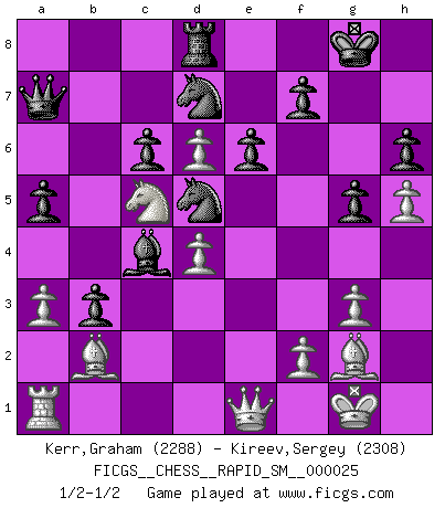 Last move : 1/2-1/2 2021 November 15 12:54:32 [Event "FICGS__CHESS__RAPID_SM__000025"] [Site "FICGS"] [Date "2021.09.10"] [Round "1"] [White "Kerr,Graham"] [Black "Kireev,Sergey"] [Result "1/2-1/2"] [WhiteElo "2288"] [BlackElo "2308"] 1.d4 d5 2.c4 c6 3.Nc3 Nf6 4.Nf3 e6 5.g3 dxc4 6.Bg2 Nbd7 7.O-O b5 8.e4 Bb7 9.e5 Nd5 10.Ng5 h6 11.Nge4 Be7 12.Qh5 Kf8 13.h4 Kg8 14.Be3 a5 15.a3 b4 16.Na4 Ba6 17.Rfe1 bxa3 18.bxa3 Qc7 19.Qf3 Rb8 20.Reb1 g6 21.Bf4 Kg7 22.Nd6 Qa7 23.Be3 Bxd6 24.exd6 Rb3 25.Rxb3 cxb3 26.Bc1 Bc4 27.Bb2 N7b6 28.Nc5 Rd8 29.h5 g5 30.Qe4 Kg8 31.Qe5 Nd7 32.Qe1 N7b6 33.Qe5 Nd7 34.Qe1 1/2-1/2 QGD Slav defense Kingside Castling by player White (move 7) This chess game ended in a draw. Follow this game move after move (download)What would Chess be without silly mistakes ? (Kurt Richter) Die Jungen erwarten, dass Opa einfach umfällt. Dann aber kann Opa fünf Stunden lang Schach spielen und die jungen Gegner an die Wand drücken. (Viktor Kortschnoi) Existen dos clases de sacrificios: los correctos y los míos. (Mikhail Tal) Le joueur d'Echecs qui veut atteindre le top est obligé de développer son propre credo créatif. Alexeï Stepanovicth Souétine. Il est facile d'écrire des livres ! Ce qui est difficile, c'est de jouer ! (Alexeï Stepanovicth Souétine) A mistake is only a mistake if you let it happen twice. Otherwise it is a learning experience. (Daniel Parmet)