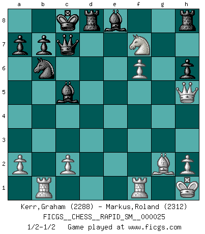 Last move : 1/2-1/2 2021 November 14 18:48:17 [Event "FICGS__CHESS__RAPID_SM__000025"] [Site "FICGS"] [Date "2021.09.10"] [Round "1"] [White "Kerr,Graham"] [Black "Markus,Roland"] [Result "1/2-1/2"] [WhiteElo "2288"] [BlackElo "2312"] 1.d4 Nf6 2.Nf3 e6 3.g3 c5 4.Bg2 cxd4 5.Nxd4 d5 6.O-O e5 7.Nb3 Be6 8.Nc3 Be7 9.Bg5 Nbd7 10.f4 exf4 11.gxf4 h6 12.Bh4 Nb6 13.f5 Bd7 14.e4 dxe4 15.Bxf6 Bxf6 16.Nxe4 Bxb2 17.Rb1 Be5 18.Qh5 Qc7 19.Nbc5 Bd4+ 20.Kh1 Bxc5 21.f6 g5 22.Nxg5 O-O-O 23.Nxf7 Be8 24.Qh3+ Bd7 25.Qh5 Be8 1/2-1/2 Queen's pawn game Kingside Castling by player White (move 6) Queenside Castling by player Black (move 22) This chess game ended in a draw. Follow this game move after move (download)Chess is ruthless: you've got to be prepared to kill people. (Nigel Short) Der beste Spieler in einem Turnier gewinnt es nie. Er landet auf Platz zwei oder drei. (Siegbert Tarrasch) Buenas posiciones no logran ganar juegos, buenas movidas sí. (Gerald Abrahams) Même si vous avez un bon coup à faire, regardez toujours s'il n'y en a pas un qui lui soit préférable. (Pedro Damiano) Success without honor is an unseasoned dish; it will satisfy your hunger, but it won't taste good. (Joe Paterno)