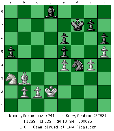 Last move : 1-0 2022 March 3 21:13:30 [Event "FICGS__CHESS__RAPID_SM__000025"] [Site "FICGS"] [Date "2021.09.10"] [Round "1"] [White "Wosch,Arkadiusz"] [Black "Kerr,Graham"] [Result "1-0"] [WhiteElo "2414"] [BlackElo "2288"] 1.e4 c5 2.Nf3 d6 3.d4 cxd4 4.Nxd4 Nf6 5.Nc3 a6 6.Be3 e5 7.Nb3 Be6 8.f3 Nbd7 9.g4 h6 10.Qd2 b5 11.O-O-O Nb6 12.Qf2 Rb8 13.Nc5 b4 14.Nxe6 fxe6 15.Nb1 d5 16.exd5 Nbxd5 17.Nd2 Be7 18.Bc4 Qc7 19.Qe2 Rd8 20.Bb3 Nxe3 21.Qxe3 Nd5 22.Qe2 O-O 23.Nc4 Bf6 24.h4 a5 25.Qe4 Nf4 26.Kb1 Rxd1+ 27.Rxd1 Rd8 28.Rxd8+ Qxd8 29.a3 Qd5 30.h5 bxa3 31.Nxa3 Qxe4 32.fxe4 Bd8 33.Kc1 Kf7 34.Kd2 1-0 Sicilian : Najdorf, Byrne (English) attack Queenside Castling by player White (move 11) Kingside Castling by player Black (move 22) Player White won this chess game. Follow this game move after move (download)The Chess pieces are the block alphabet which shapes thoughts; and these thoughts, although making a visual design on the chessboard, express their beauty abstractly, like a poem. (Marcel Duchamp) Aljechin war kein Nazi. Er war ein Opportunist. Ein schrecklicher Mann. Er liebte Geld über alles und würde für Geld ein Jude, ein Katolik oder ein Protestant werden. (Miguel Najdorf) Cuando veas una buena jugada, trata de encontrar otra mejor. (Emanuel Lasker) La guerre est enfant de la passion, la passion est enfant du narcissisme et le narcissisme est l'enfant. (...) Une autre partie ? (Thibault de Vassal) Perception is reality. (Immanuel Kant)