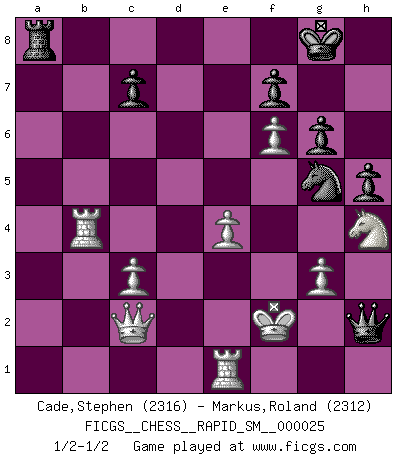 Last move : 1/2-1/2 2021 October 22 10:53:4 [Event "FICGS__CHESS__RAPID_SM__000025"] [Site "FICGS"] [Date "2021.09.10"] [Round "1"] [White "Cade,Stephen"] [Black "Markus,Roland"] [Result "1/2-1/2"] [WhiteElo "2316"] [BlackElo "2312"] 1.e4 e5 2.Nf3 Nc6 3.Bc4 Nf6 4.d3 Bc5 5.c3 d6 6.O-O O-O 7.Nbd2 a5 8.h3 h6 9.Re1 Be6 10.Bb5 Qb8 11.Nf1 Qa7 12.Be3 Bxe3 13.Nxe3 Ne7 14.a4 Ng6 15.Bc4 Bxc4 16.Nxc4 Qa6 17.g3 Rfe8 18.Ne3 Nf8 19.Qc2 Ne6 20.Kg2 b5 21.d4 Qb7 22.Nf5 bxa4 23.Rxa4 h5 24.dxe5 dxe5 25.b4 g6 26.N5h4 axb4 27.Rxb4 Qa6 28.Nxe5 Ng5 29.f4 Rxe5 30.fxe5 Qe6 31.exf6 Qxh3+ 32.Kf2 Qh2+ 1/2-1/2 Two knights defense (Modern Bishop's Opening) Kingside Castling by player White (move 6) Kingside Castling by player Black (move 6) This chess game ended in a draw. Follow this game move after move (download)When in doubt... play Chess ! (Tevis) Schach wird sich dank seiner hohen kulturellen Tradition immer durchsetzen. In näherer Zukunft womöglich sogar als Gegenreaktion auf die maßlose Reizüberflutung im Freizeit- und Spielbereich. (Garry Kasparov) Tu puedes aprender mucho mas de una partida que pierdas que de una partida ganada. Tendras que perder cientos de partidas antes de llegar a ser un buen jugador. (Jose Raul Capablanca) Les échecs sont plus proches de l'art de l'assassinat que de l'art de la guerre. (Arturo Perez-Reverte) Who needs drugs and alcohol if he can play Big Chess at FICGS ? (Heinz-Georg Lehnhoff)