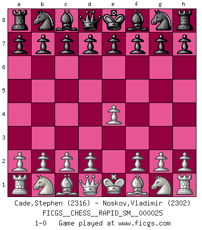 Last move : 1-0 2021 October 11 18:48:55 [Event "FICGS__CHESS__RAPID_SM__000025"] [Site "FICGS"] [Date "2021.09.10"] [Round "1"] [White "Cade,Stephen"] [Black "Noskov,Vladimir"] [Result "1-0"] [WhiteElo "2316"] [BlackElo "2302"] 1.e4 1-0 This chess game has been lost on time (started : 2021.09.10 23:12:35) King's pawn Opening Player White won this chess game. Follow this game move after move (download)Chess is war over the board. The object is to crush the opponents mind. (Bobby Fischer) Das Blackmar-Diemer-Gambit verändert den ganzen Menschen! (Emil Joseph Diemer) Cualquier cambio de material en una posición debe venir por medio de un mate, una captura o promoción de Peón. (Purdy) Je crois qu'il existe des manières très spécifiques de jouer efficacement contre une machine. Evidemment, nous n'avons aucune chance en technique pure, parce que l'ordinateur calcule de manière parfaite. Mais lorsque nous faisons appel à notre cerveau, en utilisant l'intuition et la compréhension, alors nous restons beaucoup plus forts. (Anatoli Karpov) If only people were all showed a certain minimum level of niceness; if only people didn't retract verbal draw offers (without draw box ticked) on ficgs; if only people didn't kill; if only people didn't run concentration / extermination camps, if only people didn't drop nuclear bombs on Hiroshima and Nagasaki, and so on - it would be a much more beautiful world. But sadly, things are not so... (Normajean Yates)