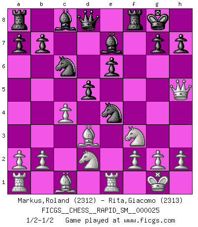 Last move : 1/2-1/2 2021 October 4 18:47:50 [Event "FICGS__CHESS__RAPID_SM__000025"] [Site "FICGS"] [Date "2021.09.10"] [Round "1"] [White "Markus,Roland"] [Black "Rita,Giacomo"] [Result "1/2-1/2"] [WhiteElo "2312"] [BlackElo "2313"] 1.e4 c5 2.c3 Nf6 3.e5 Nd5 4.Nf3 d6 5.d4 cxd4 6.Qxd4 e6 7.Nbd2 Nc6 8.Qe4 f5 9.exf6 Nxf6 10.Qh4 d5 11.Bd3 Bd6 12.O-O O-O 13.c4 Be7 14.Re1 Ne4 15.Qh5 Nf6 16.Qh4 Ne4 17.Qh5 1/2-1/2 Sicilian : Alapin's variation (2.c3) Kingside Castling by player White (move 12) Kingside Castling by player Black (move 12) This chess game ended in a draw. Follow this game move after move (download)Your body has to be in top condition. Your Chess deteriorates as your body does. You can't separate body from mind. (Bobby Fischer) Konzentriere dich auf materielle Gewinne. Nimm, was dir dein Gegner gibt, ausser es gibt einen guten Grund der dagegenspricht. (Robert James Fischer) En manos de Fischer's, una diminuta ventaja teórica es tan buena como tener una Reina de ventaja. (Isaac Kashdan) Comme les marins qui ont mille raisons différentes d'aller en mer, les joueurs d'échecs en ont tout autant avant de s'installer devant une table et jouer... (Vincent Bertignac, philosophe) Everybody lies. (Gregory House, House M.D.)