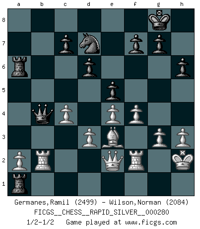 Last move : 1/2-1/2 2021 November 23 8:43:55 [Event "FICGS__CHESS__RAPID_SILVER__000280"] [Site "FICGS"] [Date "2021.09.11"] [Round "2"] [White "Germanes,Ramil"] [Black "Wilson,Norman"] [Result "1/2-1/2"] [WhiteElo "2499"] [BlackElo "2084"] 1.c4 e5 2.Nc3 Nf6 3.Nf3 Nc6 4.g3 Bb4 5.Bg2 O-O 6.O-O Bxc3 7.bxc3 d6 8.d3 a6 9.Rb1 h6 10.Nd2 Re8 11.Qa4 Ra7 12.Qc2 Bg4 13.e4 Qd7 14.f4 Bh3 15.Nf3 Bxg2 16.Qxg2 b5 17.cxb5 axb5 18.Rxb5 R7a8 19.Nh4 Ra6 20.c4 Rea8 21.Rb2 Nd4 22.h3 Ra3 23.Rd2 R3a6 24.Nf3 Nxf3+ 25.Rxf3 Rb8 26.Rc2 Qa4 27.Qe2 Rb1 28.Kh2 Ra1 29.Rf2 Nd7 30.Be3 Qb4 31.Rb2 1/2-1/2 English Opening Kingside Castling by player Black (move 5) Kingside Castling by player White (move 6) This chess game ended in a draw. Follow this game move after move (download)In blitz, the Knight is stronger than the Bishop. (Vlastimil Hort) Ich spiele ehrlich und spiele, um zu gewinnen. Wenn ich verliere nehme ich meine Medizin. (Robert James Fischer) En el tablero, la mentira e hipocresía no sobreviven mucho. (Emanuel Lasker) Que feriez-vous si vous étiez en train de jouer aux échecs et que la fin du monde arrive ? Je continuerais à jouer. (Saint Borromée) Do not put your faith in what statistics say until you have carefully considered what they do not say. (William W. Watt)