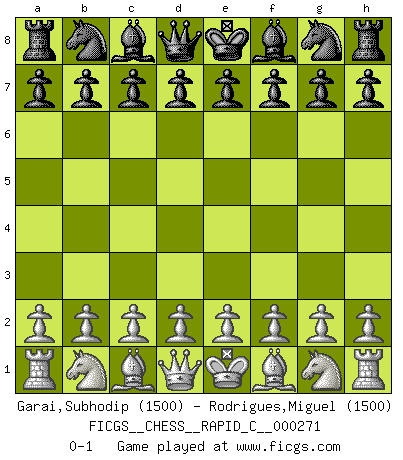 Last move : 0-1 2021 October 13 12:54:34 [Event "FICGS__CHESS__RAPID_C__000271"] [Site "FICGS"] [Date "2021.09.13"] [Round "1"] [White "Garai,Subhodip"] [Black "Rodrigues,Miguel"] [Result "0-1"] [WhiteElo "1500"] [BlackElo "1500"] 0-1 This chess game has been lost on time (started : 2021.09.13 7:16:16) Player Black won this chess game. Follow this game move after move (download)One bad move nullifies forty good ones. (Horowitz) Frage des Reporters: -Welche besonderen Umstände rechtfertigen das Anhalten der Uhren während einer Turnierpartie? Antwort: -Einen Fotographen zu strangulieren. (Siegbert Tarrasch) Después de la respuesta de las negras a 1.e4 con 1..e5, se quedan siempre tratando de entrar dentro del juego. (Howard Staunton) Karpov est une pièce de musée. (Garry Kasparov) There's no money in correspondence chess. (John Knudsen)