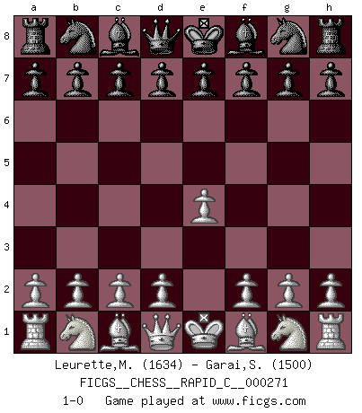 Last move : 1-0 2021 October 13 12:54:34 [Event "FICGS__CHESS__RAPID_C__000271"] [Site "FICGS"] [Date "2021.09.13"] [Round "1"] [White "Leurette,Marc-Antoine"] [Black "Garai,Subhodip"] [Result "1-0"] [WhiteElo "1634"] [BlackElo "1500"] 1.e4 1-0 This chess game has been lost on time (started : 2021.09.13 7:16:16) King's pawn Opening Player White won this chess game. Follow this game move after move (download)Nothing excites jaded Grandmasters more than a theoretical novelty. (Dominic Lawson) Wer wird heute Abend ihr Gegner sein? -- Heute Abend spiele ich gegen die schwarzen Steine. (Akiba Rubinstein) a manera como él juega al Ajedrez, demuestra la completa naturaleza de un hombre. (Stanley Ellin) Il n'y a pas de prix trop élevé au scalp de l'ennemi. (Koblentz) Internet: Absolute communication, absolute isolation. (Paul Carvel)