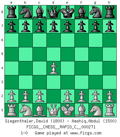 Last move : 1-0 2021 October 13 12:54:34 [Event "FICGS__CHESS__RAPID_C__000271"] [Site "FICGS"] [Date "2021.09.13"] [Round "1"] [White "Siegenthaler,David"] [Black "Aashiq,Abdul"] [Result "1-0"] [WhiteElo "1800"] [BlackElo "1500"] 1.d4 1-0 This chess game has been lost on time (started : 2021.09.13 7:16:16) Queen's pawn Player White won this chess game. Follow this game move after move (download)Chess is a fighting game which is purely intellectual and includes chance. (Richard Reti) Ich rechne überhaupt nicht voraus. Ich gewinne auch so. (Robert James Fischer) Muchos jugadores de Ajedrez se sorprendían cuando después de la partida, Fischer explicaba con calma: 'Yo ya había analizado esta posibilidad' en una posición en la cual yo creía que no era posible de prever desde la apertura. (Mikhail Tal) Psychologiquement, tu dois avoir confiance en toi même, mais cette confiance doit être basée sur des faits. (Robert Fischer) You have to believe in yourself. (Sun Tzu)